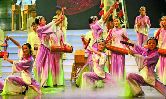 青年时报10月17日讯:烟雾缭绕的舞台,被装扮成绿竹林,随着“咚咚”的节奏,“竹子”轻轻摇摆,不时发出“沙沙”的响声,这一切构成了一首美妙的《竹林交响曲》。图为浙江林学院学生将观众带入一片绿竹林。