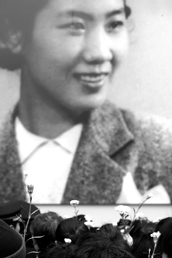 “感怀一曲断肠夜,知音千古此心同,尽在不言中。” 袁雪芬安卧在龙华殡仪馆大厅中央的白色玫瑰台上,耳旁环绕的不是哀乐,而是她在越剧《西厢记》中的知名唱段《琴心》;大厅外的广场上,戏迷们拉起的挽联与之交相辉映:“雪声已成千古绝唱。”