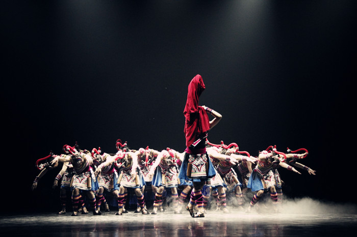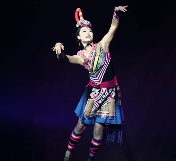 作品编排得极具畲族文化特色,别出心裁地在舞蹈演员手臂、腿部绑了六块竹板。舞蹈一开场,在完全没有音乐和灯光效果的状态下,竹板敲击传出的节拍声引人入胜。而舞蹈的最后,一位披着红盖头的少女在台上舞动,展现了对幸福生活的向往。音乐停止,灯光暗下,竹板所发出的节拍声依旧继续,寓意生命的延续。