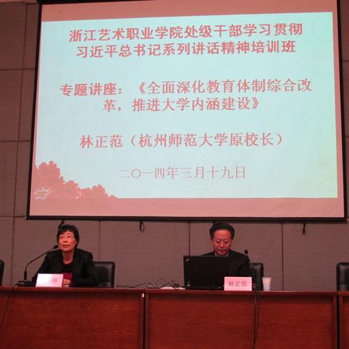 3月19日下午,省高校讲师团专家、原杭州师范大学校长林正范教授应邀来浙江艺术职业学院,为处级干部学习习近平总书记系列讲话精神培训班作题为《深化改革是促进高等教育发展与质量提升的强大动力》专题讲座。学院党政班子成员和中层处级干部等听取讲座。