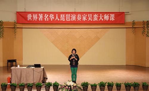 《春江花月夜》、《十面埋伏》、《静夜思》、《九月扬花飞》、《跳吧!》,从传统琵琶古曲到新派琵琶音乐,吴蛮用独特的革新与创举将琵琶介绍到西方,开拓一条“中西合璧,纳古于今”的琵琶之路。课上,她从传统音乐的自信心、合作演奏的新作品和音乐跨界问题这三方面来阐述民乐人如何以独特视角看中国传统音乐在国际中的发展。带着琵琶闯荡天下,没有信心真得难成大家。90年初,美国没有人知道中国传统乐器,也没有人了解中国传统音乐,作为单身一人独闯美国的琵琶演奏家,吴蛮用强大的自信心和扎实的功底,向世界介绍中国的民乐,介绍中国的传统文化。她认为音乐无国界,传统音乐比西洋乐更有发展空间,学生应做好扎实的基本功训练,认真学习,持之以恒,静心感悟,这样定能在音乐道路上有美好的发展前景。在演奏新作品时,她提醒学生不能遗忘传统根基,只炫技巧,要了解整部作品的结构、内容,把握每一次独奏、合奏的机会,多与作曲者交流,让作曲者了解乐器特点,在交流探讨中创造出优秀的作品。如何将琵琶与世界各类音乐跨界合作,创作出既具中国民族特色,又有时尚气息的世界音乐,这需要每位演奏家相互配合,取其精华,这样才能创作出浑然一体、旋律动人、广为流传的世界音乐。现场,为配合演讲内容,吴蛮还播放几段个人跨界合作的音乐作品。当代音乐不仅仅属于西方,它属于全世界,属于全人类。在演讲中,她无时无刻都传递着这样一个信息:传统即是国际。