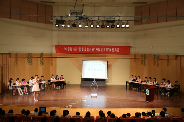 接着,第六届“校园读书月”活动颁奖典礼也在当晚举行。宣传教育处处长马向东宣布了2014年度优秀读者的名单并进行表彰,学生处副处长郑园全宣布“书海寻宝”趣味活动获奖名单。最后,基础教学部副主任史长虹公布了当晚“中华好诗词”比赛的获奖名单。