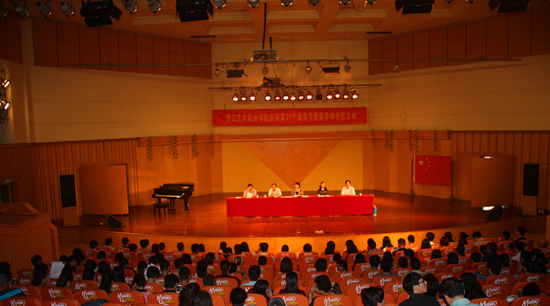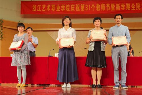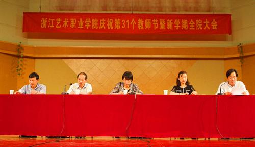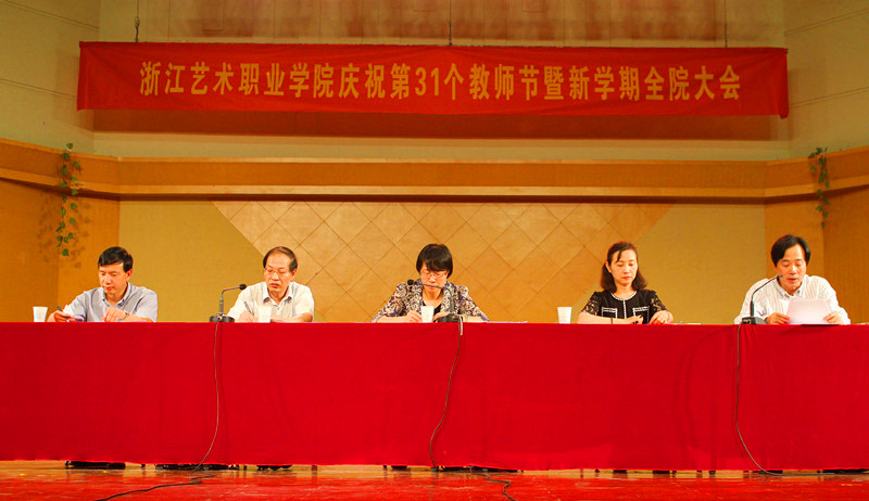 9月16日下午,我院在音乐厅隆重举行庆祝第31个教师节暨新学期全院大会。院党委书记、副院长朱海闵,党委副书记黄杭娟,党委委员、副院长章轲,党委委员、副院长沈恒,党委委员、纪委书记夏开堂全院教职工参加会议。会议由章轲副院长主持。