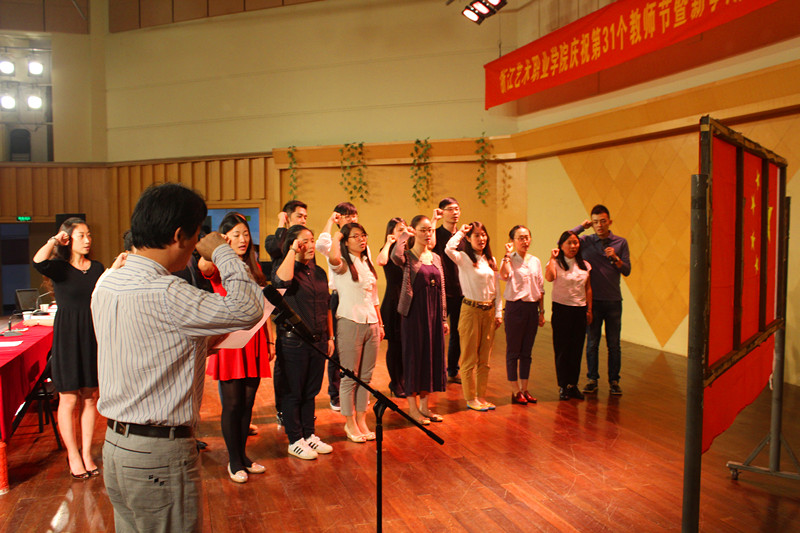 颁奖仪式结束后,2015年度新进专职教师在副院长沈恒的领誓下,在全院教职工的见证下,面对国旗庄严宣誓,用这样一种特殊的方式开启一名人民教师的执教生涯。