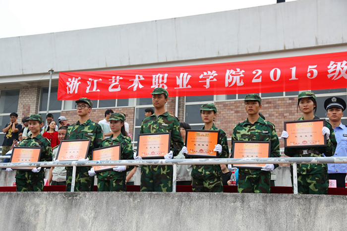 黄杭娟现场宣布军训获奖名单。15少儿音舞班、15编导班、15键盘班、15装饰班、15电声班、15多媒体班、15文管班获得军训会操先进集体;15少儿音舞、15舞台(二年制)班、15装饰(二年制)班、15文鉴(二年制)班、15电声(二年制)班、15广告班获得军训内务先进集体;陈品杰、裘梦钰、古顺义、韦奕飞、张宇、王剑鑫等30名同学获得军训优秀学员。