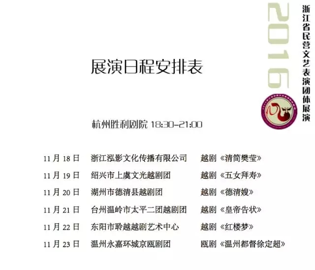 本次参演剧团表演精湛,代表着当地民营剧团艺术表演水准。展演期间,10家民营剧团的当家剧目——越剧《清简樊莹》《五女拜寿》《德清嫂》《皇帝告状》《红楼梦》《花中君子》,瓯剧《温州都督徐定超》,甬剧《呆大烧香》,婺剧《秦门忠义》,京剧《改容战父》将分别在浙江胜利剧院和东阳大剧院演出。
