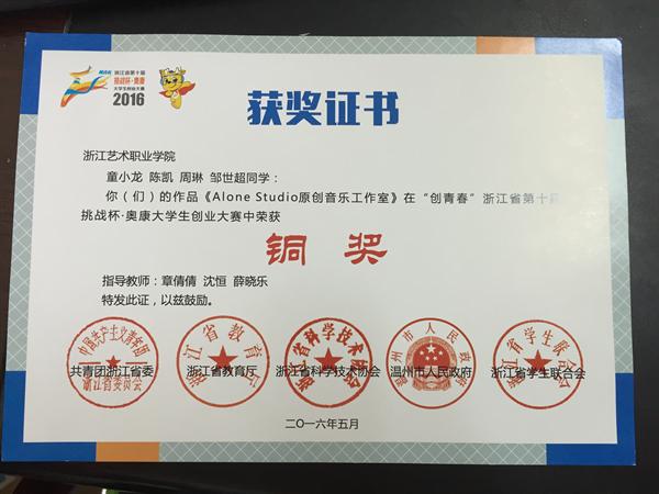 《Alone Studio原创音乐工作室》项目成员由音乐系学生童小龙、陈凯、周琳、邹世超等四位同学组成,副院长沈恒和音乐系教师章倩倩、薛晓乐等教师负责指导。通过校内选拔推荐,我院共有4件作品入围省级复赛,最终《Alone Studio原创音乐工作室》进入决赛喜获铜奖。