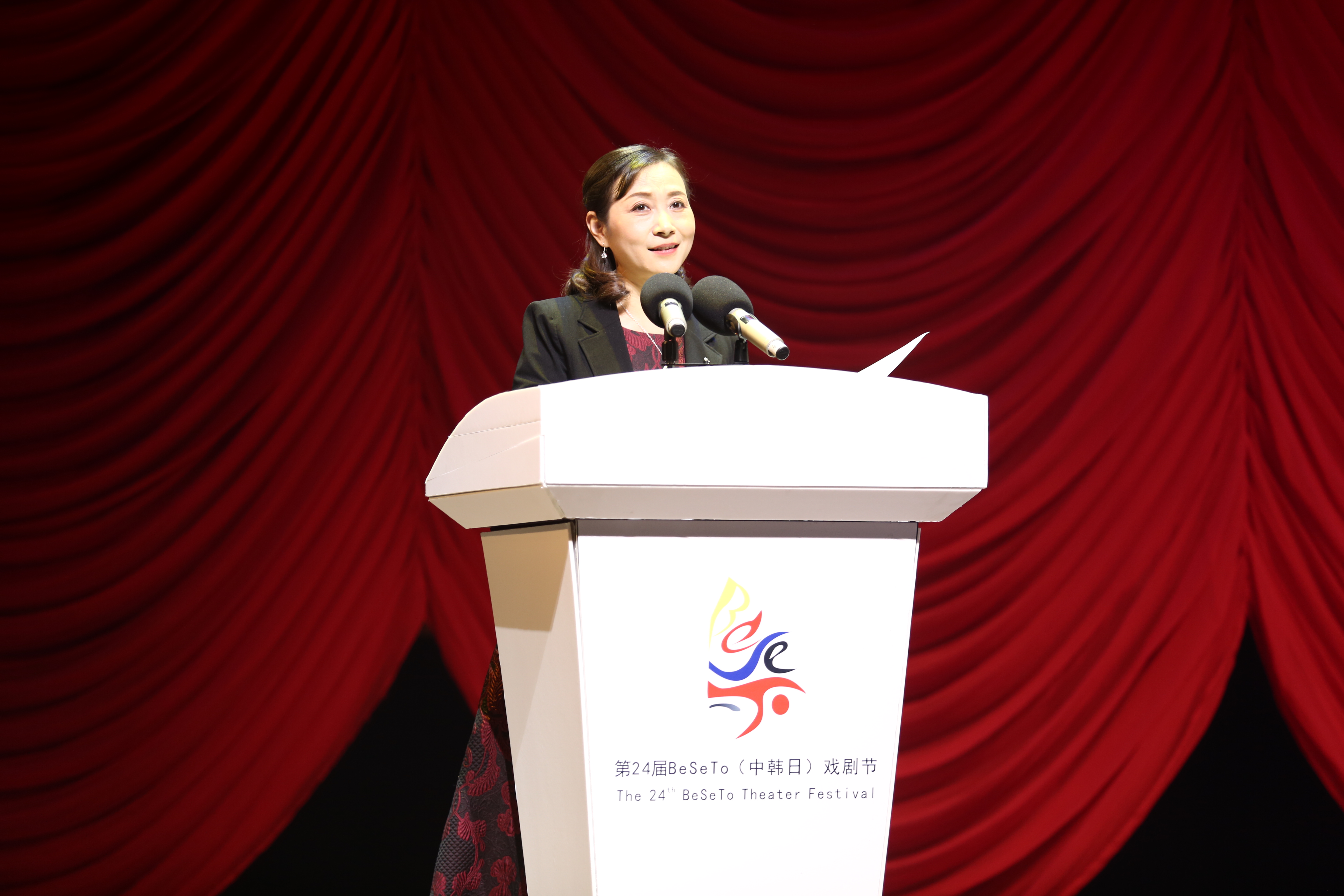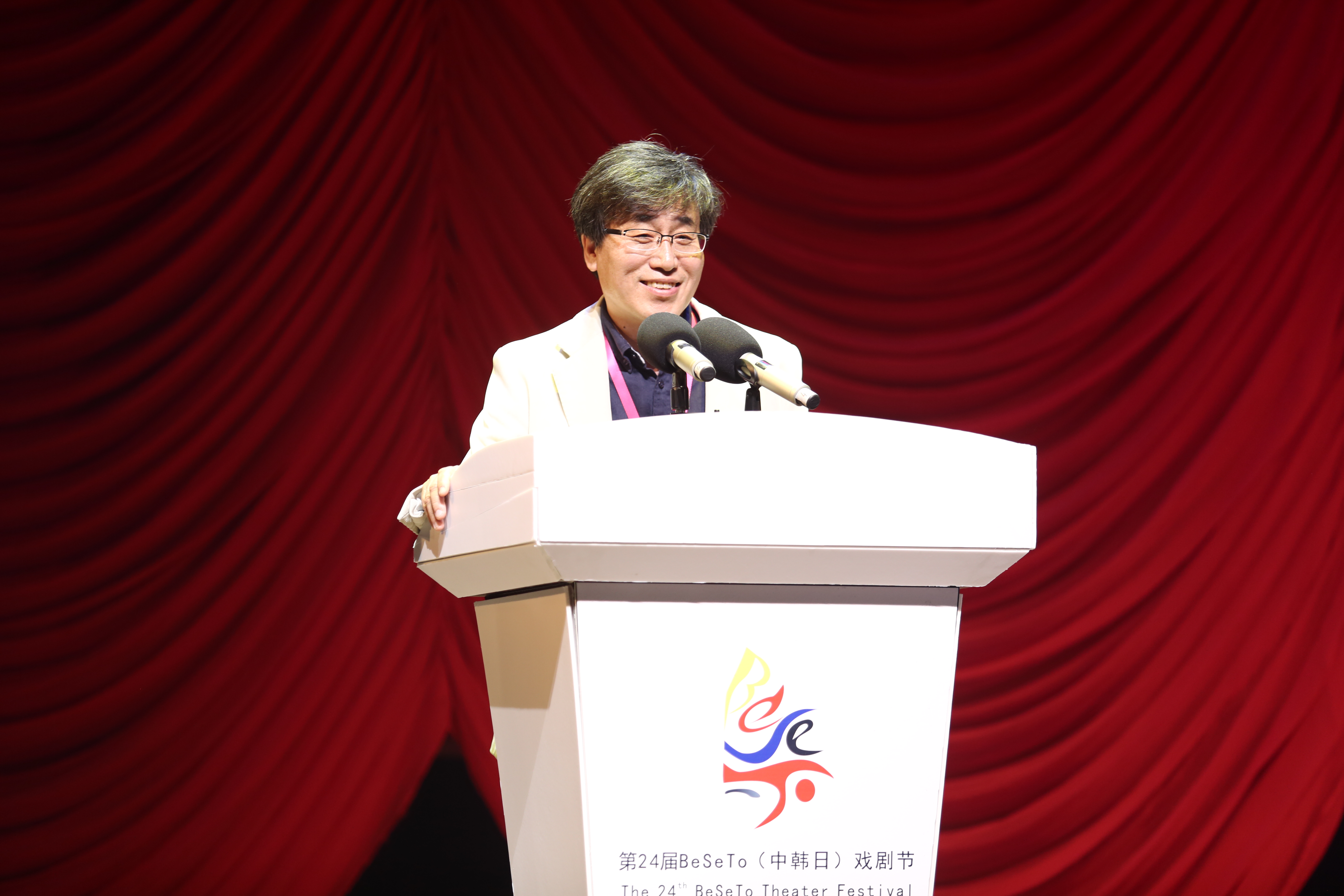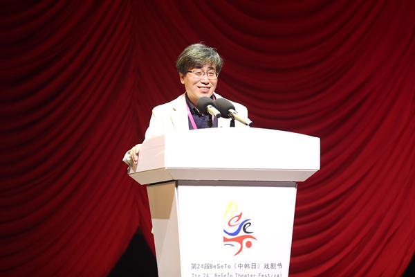 日本导演、百景社剧团团长志贺亮史代表BeSeTo戏剧节日本委员会发言。他对受邀参加中韩日戏剧节演出感到非常荣幸。中韩日戏剧节不间断地举办了24年非常了不起,日本和中国的话剧合作非常紧密,为能和中韩戏剧人共同履行BeSeTo戏剧梦感到光荣。