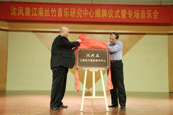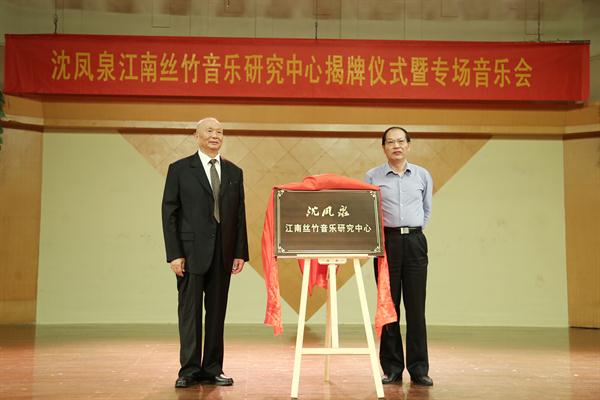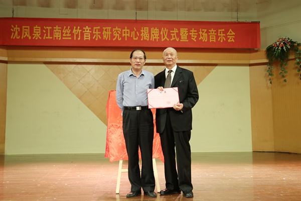 章轲为沈凤泉授予“江南丝竹音乐”工作室专家聘书,并与沈凤泉共同为“沈凤泉江南丝竹音乐研究中心”揭牌。