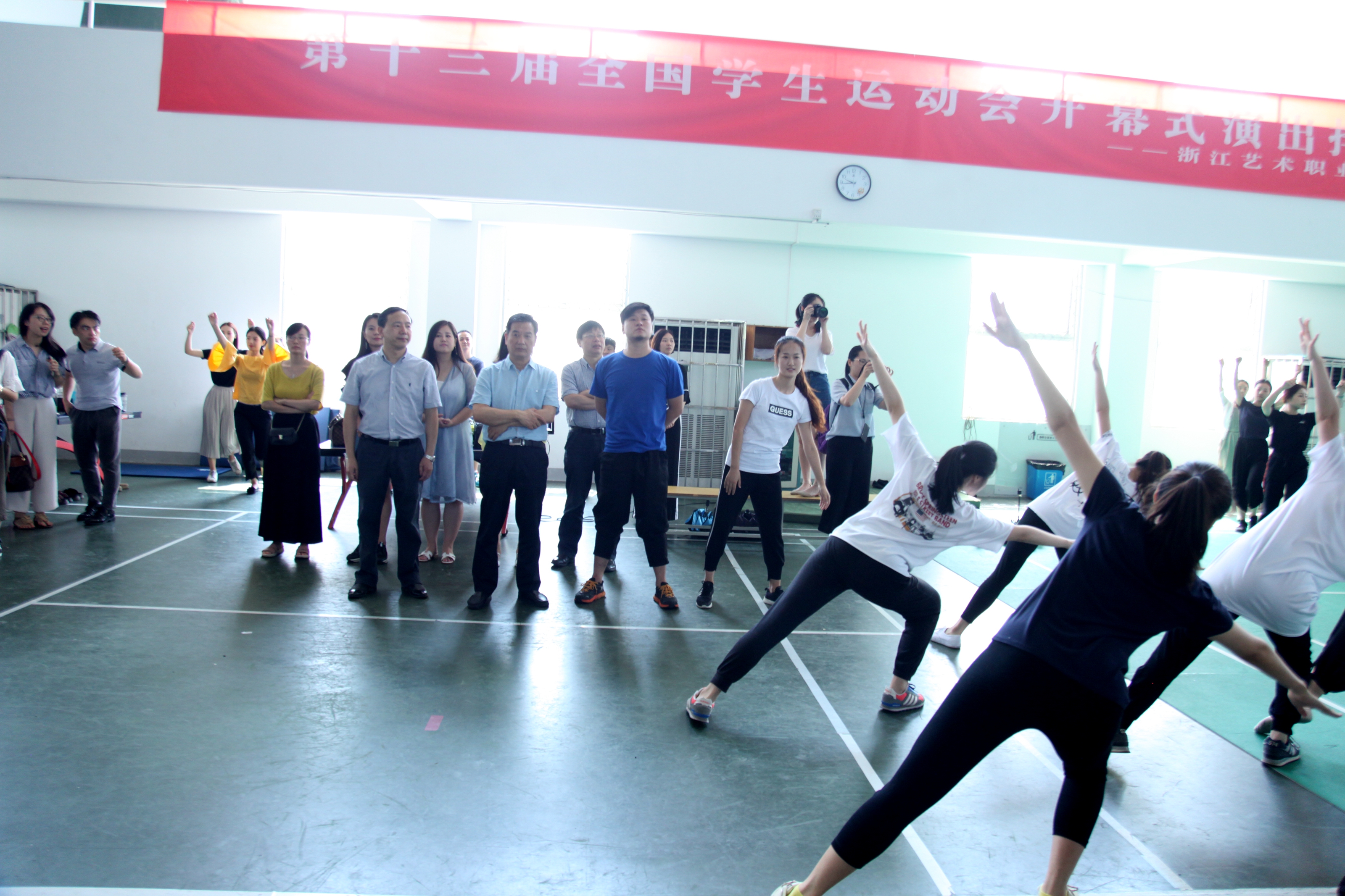 鲍学军在看完节目排练后向师生们表示亲切慰问。他在讲话中表示,在高温酷暑下,同学们老师们放弃暑假休息,克服种种困难,以高昂的斗志、饱满的激情参与排练,展现出良好的精神风貌,体现了当代大学生的精神和价值。他强调全国学生运动会的重要性和参演节目的重要性,表示正在排练的节目是运动会开幕式的压轴戏,这个节目是否精彩圆满,能否在全国电视直播当中展现浙江学子的良好风貌,参演的师生们将承担重任。这次运动会是首次全国大中学生运动会叠加、合并后同时同地举办的全国性学生运动会,也是迄今为止浙江省承办最大规模的体育运动会,是展现浙江精神、杭州风貌和浙江教育的重要平台,我们要把它当作一项政治任务,一定要把运动会办得精彩圆满。他希望同学们继续努力,圆满完成任务。他感谢两所艺术院校,感谢导演和老师们,希望浙艺继续做好后勤保障工作,共同完成这项光荣的使命。