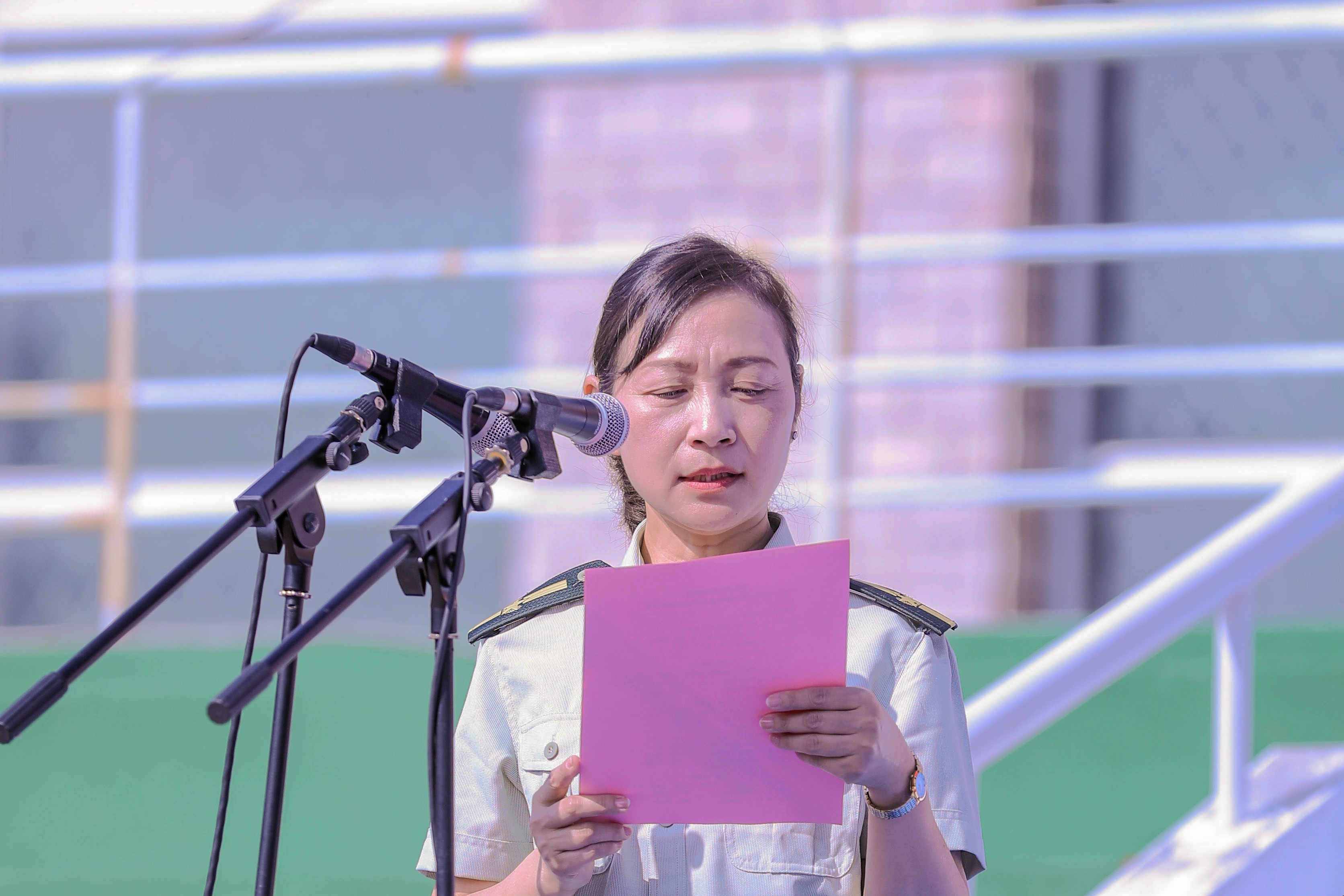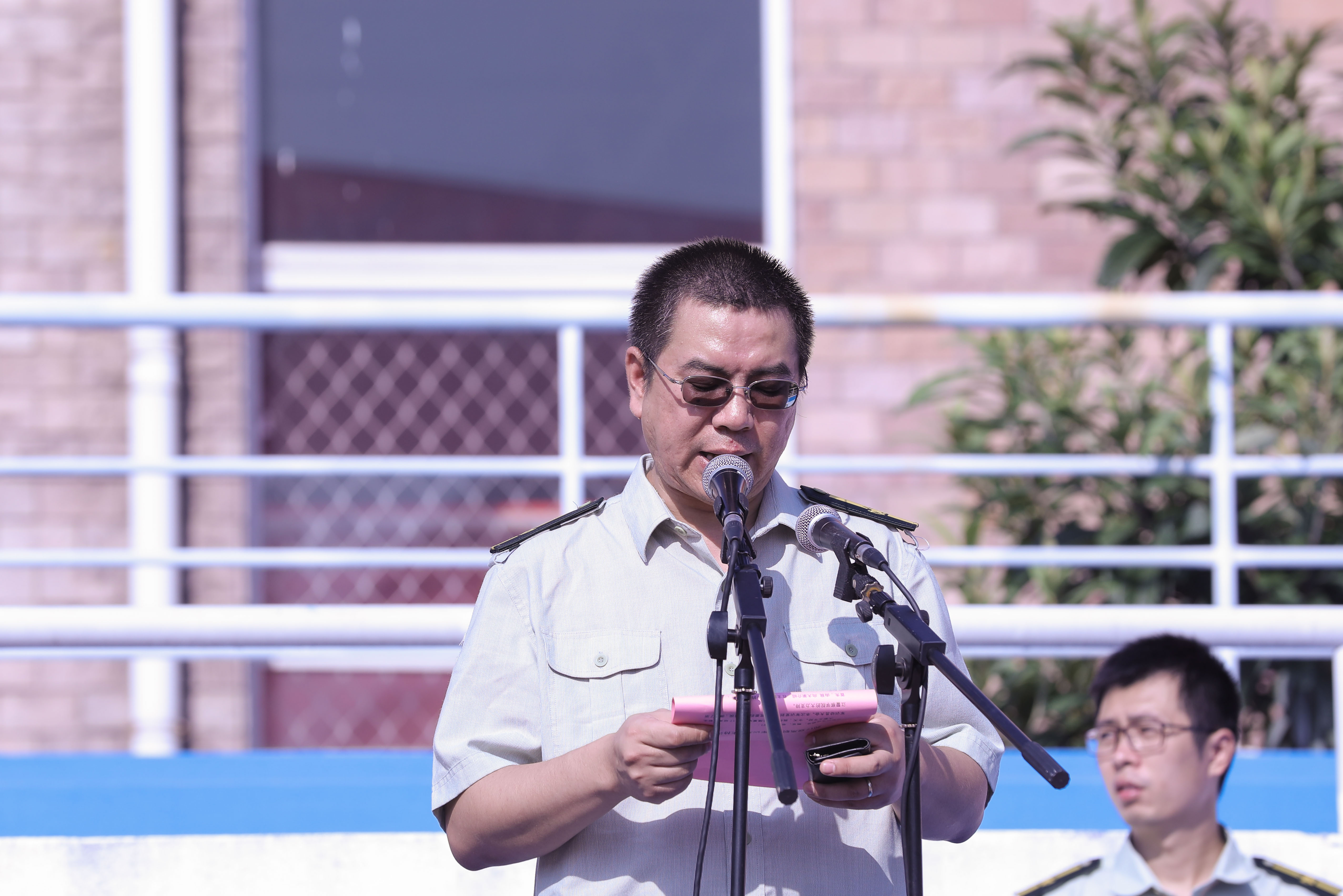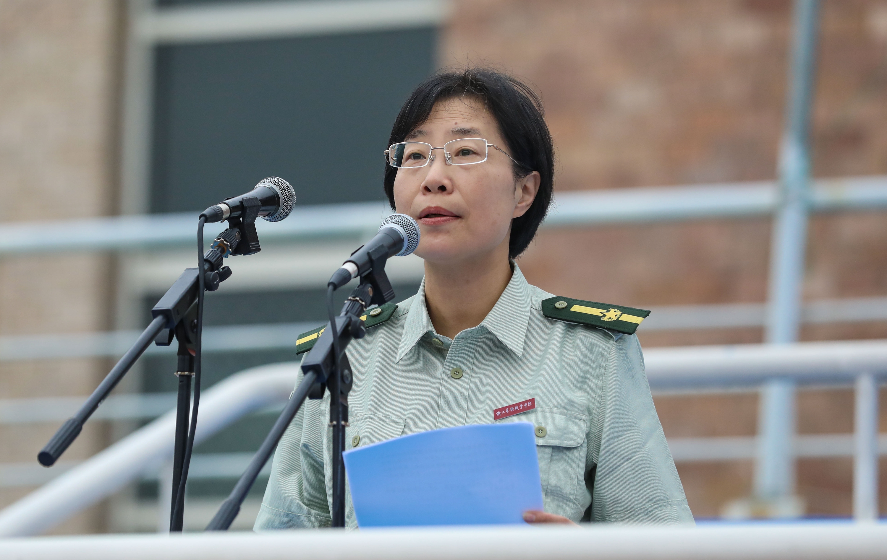 朱海闵作军训动员讲话。她代表学院向一直以来大力支持、全力保障我院军训工作的浙江警察学院表示衷心的感谢,再一次对2017级新同学的到来表示热烈的欢迎。她表示,军训是大学生增强国防观念,弘扬爱国主义、集体主义的重要途径,是掌握基本的军事技能和军事理论的必要形式,更是加强学风、校风建设,全面推进素质教育的重要内容,是每届学子入校后的第一门必修课。她希望通过军训这门课,同学们至少能有三点收获:一是像军人那样忠诚担当;二是像军人那样意志如钢;三是像军人那样团结守纪。她勉励同学们:“为期12天的军训生活即将开始,你们马上就要在训练场上挥洒你们的青春和汗水,开启你们崭新的人生阶段。希望大家能够通过自己的努力,圆满完成军训任务;也真诚地祝福大家,在接下来的三年大学生活里,能够回答好黄杭娟院长在开学典礼上提出的求学之问,为自己的大学生涯写下令人满意的答卷”。