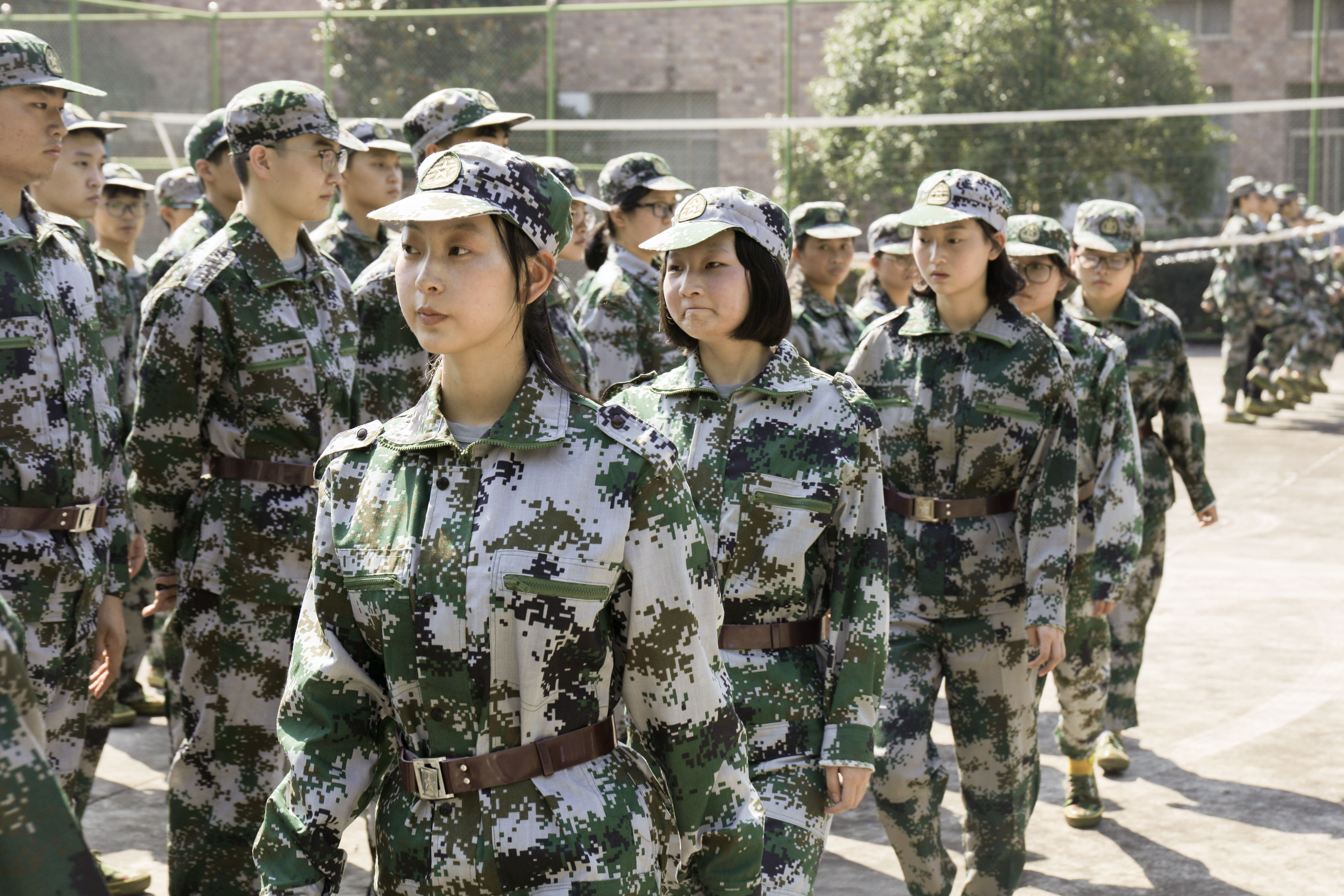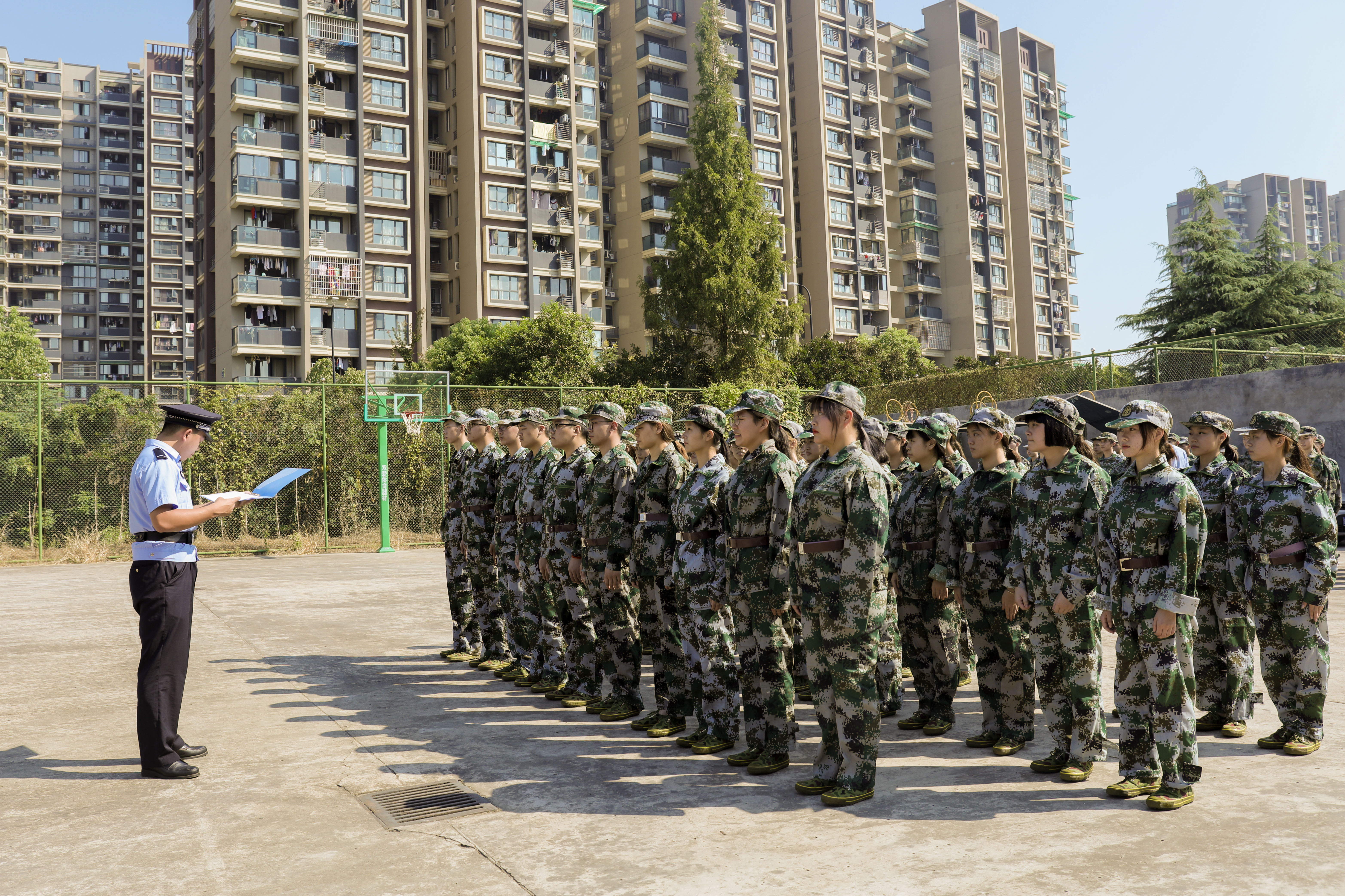军训内容包括立正、稍息、跨立、蹲下(起立)、停止间转法、敬礼(礼毕)、齐步(腿部练习)、齐步行进与立定、分列式(跟音乐踩点)、表演方阵、跑步行进与立定等室外训练,还有内务规范整理,军事理论,消防安全讲座等项目。