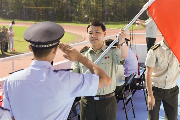 黄杭娟宣读军训团营以上干部及教官名单。伴随着雄壮的军乐声,夏开堂为军训营授旗。