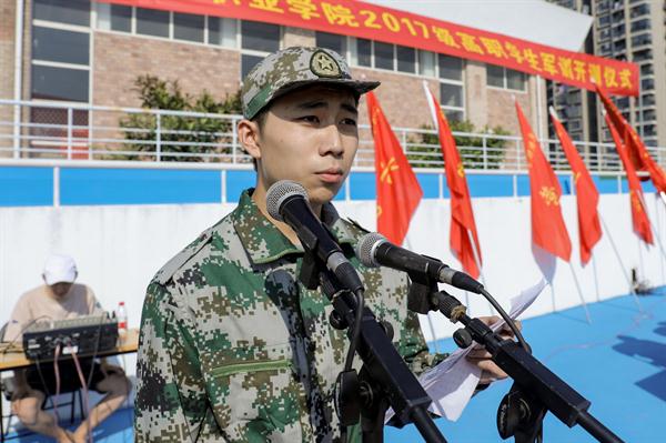 新生代表、戏剧系陈坚持同学在发言中说:“今天是我们每一个新生感到自豪的日子,因为我们要在这美丽的校园中放飞梦想,而一切都要从军训开始。军训是磨炼意志的练兵场,更是充满挑战的大擂台,也许你们会遇到很多困难,但是你会从中获得许多宝贵的记忆。我们要发扬军人的作风,无论多苦多累,风吹雨打,我们都绝不退却,一切行动听从指挥。我们在军训中就是要强调组织纪律性,培养集体观念,凝聚团队精神,以良好的个人作风推动形成良好的班级风气。”