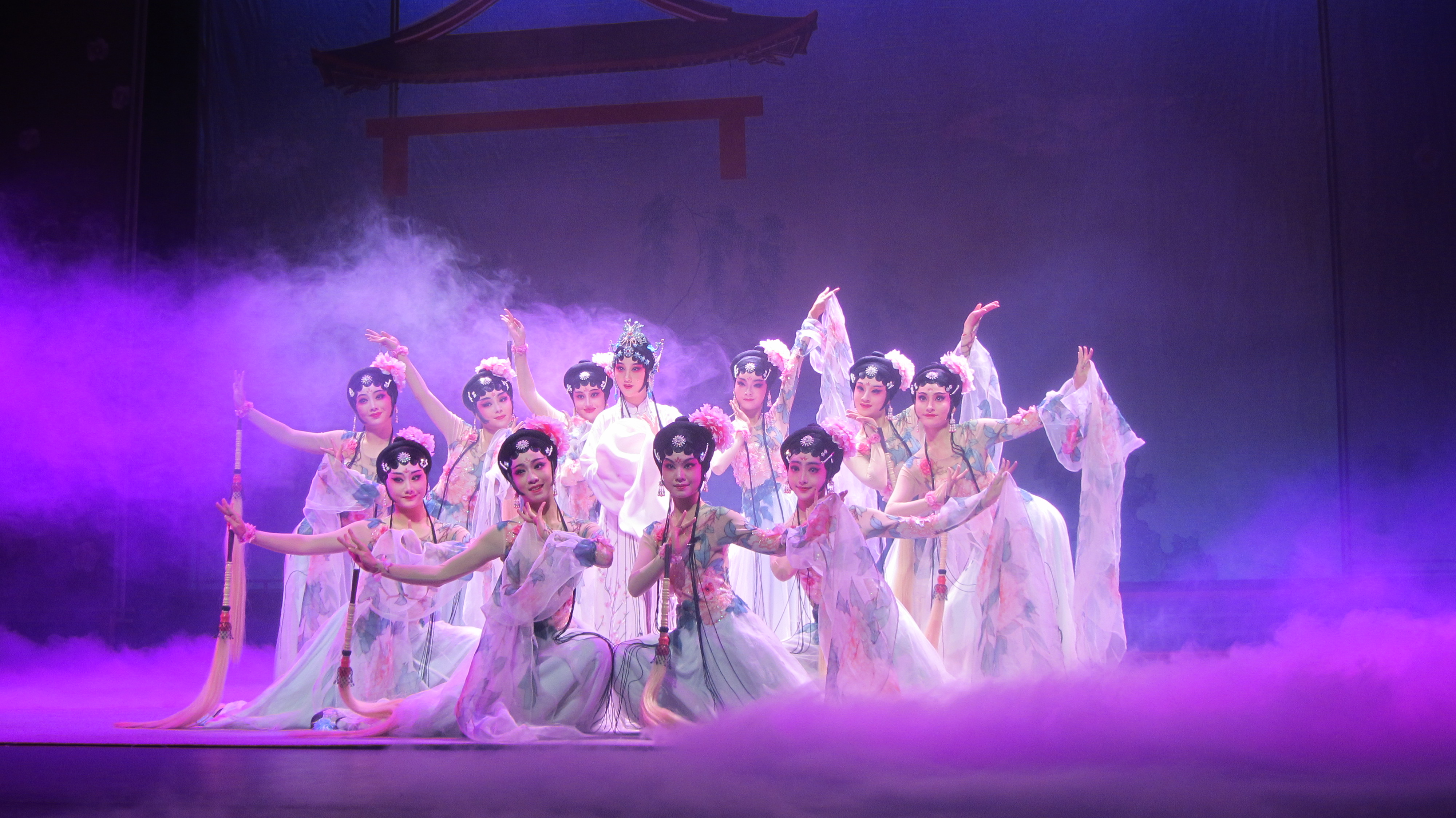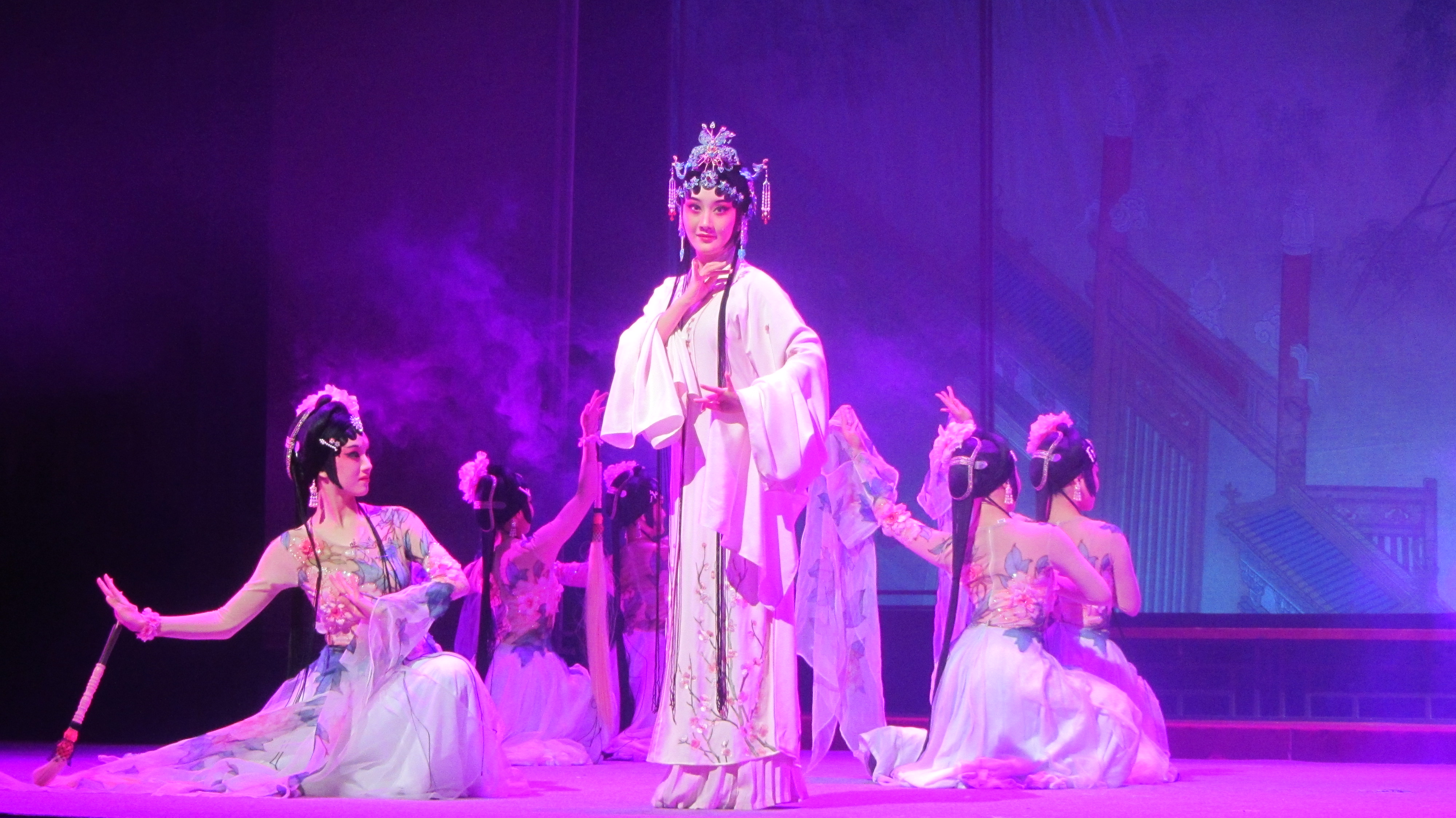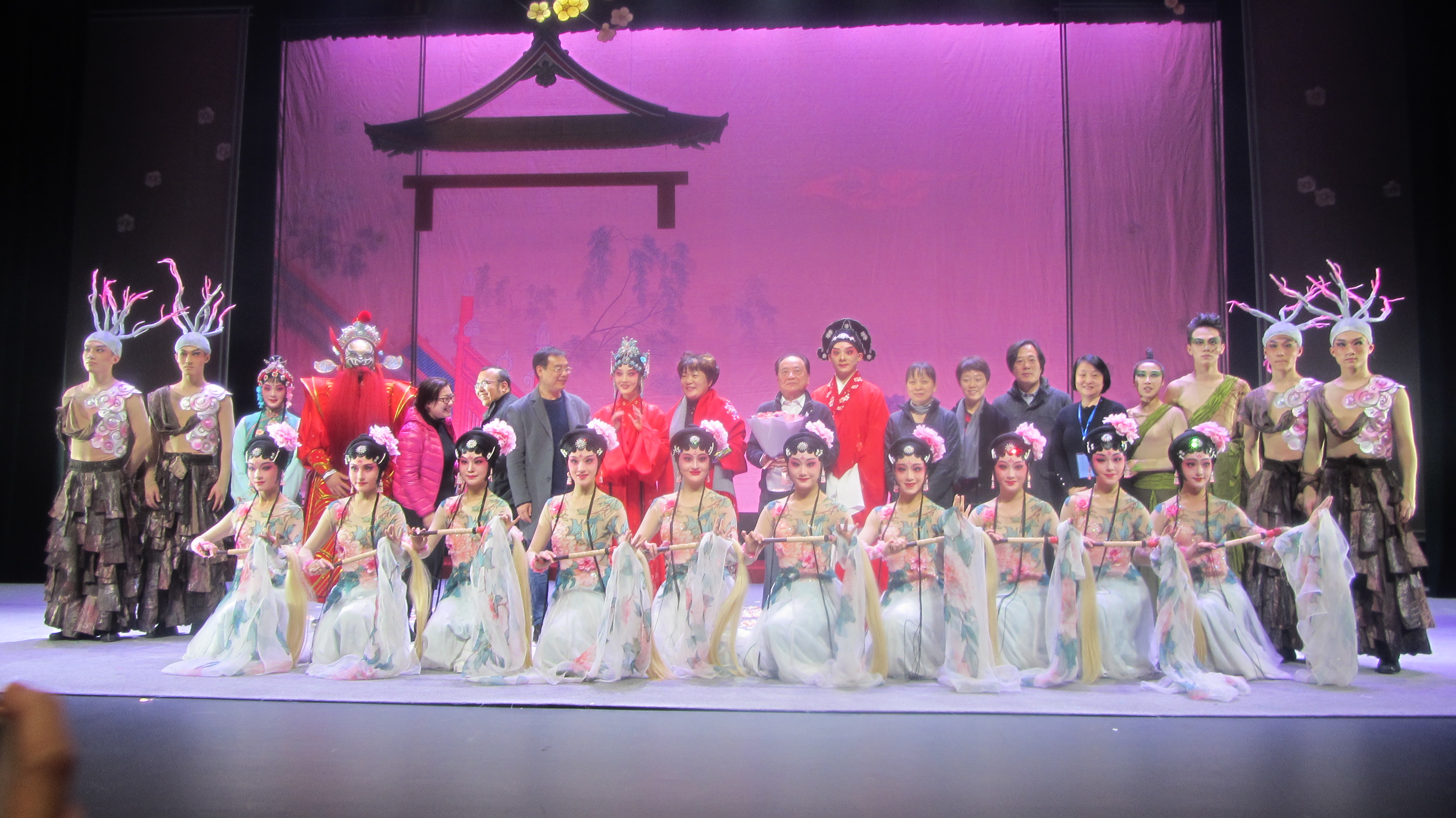 盛大的颁奖典礼过后,梦幻版昆剧《牡丹亭》正式登台。明代大戏剧家汤显祖所著传奇剧作《牡丹亭》将诗情、美蕴、哲思交融互汇,创作出中国浪漫文学的一座高峰,自问世400多年来,历演不衰,享誉海内外。梦幻版昆剧《牡丹亭》由浙艺戏剧系13级昆剧班、音乐系民乐教研室师生共同演绎,撷取原著“至情”之精华,以万紫千红的满园春色为映衬,用别开生面的艺术手法构筑起独特的意向空间,“惊梦”、“寻梦”、“离梦”、“追梦”、“幽梦”、“圆梦”6个主题先后贯穿始终,将杜丽娘和柳梦梅这对有情人的相思相悦演化成令人憧憬向往的绝美胜境,再现了缠绵400多年的生死至情和道不尽的前生缘、今世梦。浙艺版《牡丹亭》的所有演员都正值二八年华,是一部充满青春气息的剧作。为了突出与以往版本的不同亮点,梦幻版《牡丹亭》更是增添了翩然起舞的众花神、婀娜摇曳的柳树等具有极佳视觉效果的全新元素,一经亮相便艳惊四座。现场,落英缤纷的花瓣从舞台上方徐徐坠落,似真似幻的烟雾缓缓缭绕,仿佛真的将观众带入了这对年轻人情定终生的牡丹亭下。演出过程中,观众为杜丽娘、柳梦梅的秀雅所吸引,也为群演腾空、做打等绝活报以热烈掌声。演出结束后,热情的观众久久不愿离去,纷纷跑上舞台与演员合影留念。