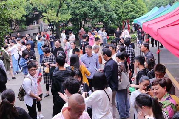 早晨七点,考生们就进入浙艺校园,或在艺池边,或在中心广场,或在图书馆旁,拿着台词,下着腰,喊两嗓开开嗓准备考试。五号楼前,红红火火的横幅正在鼓励考生:自信备考,为理想插上艺术的翅膀。