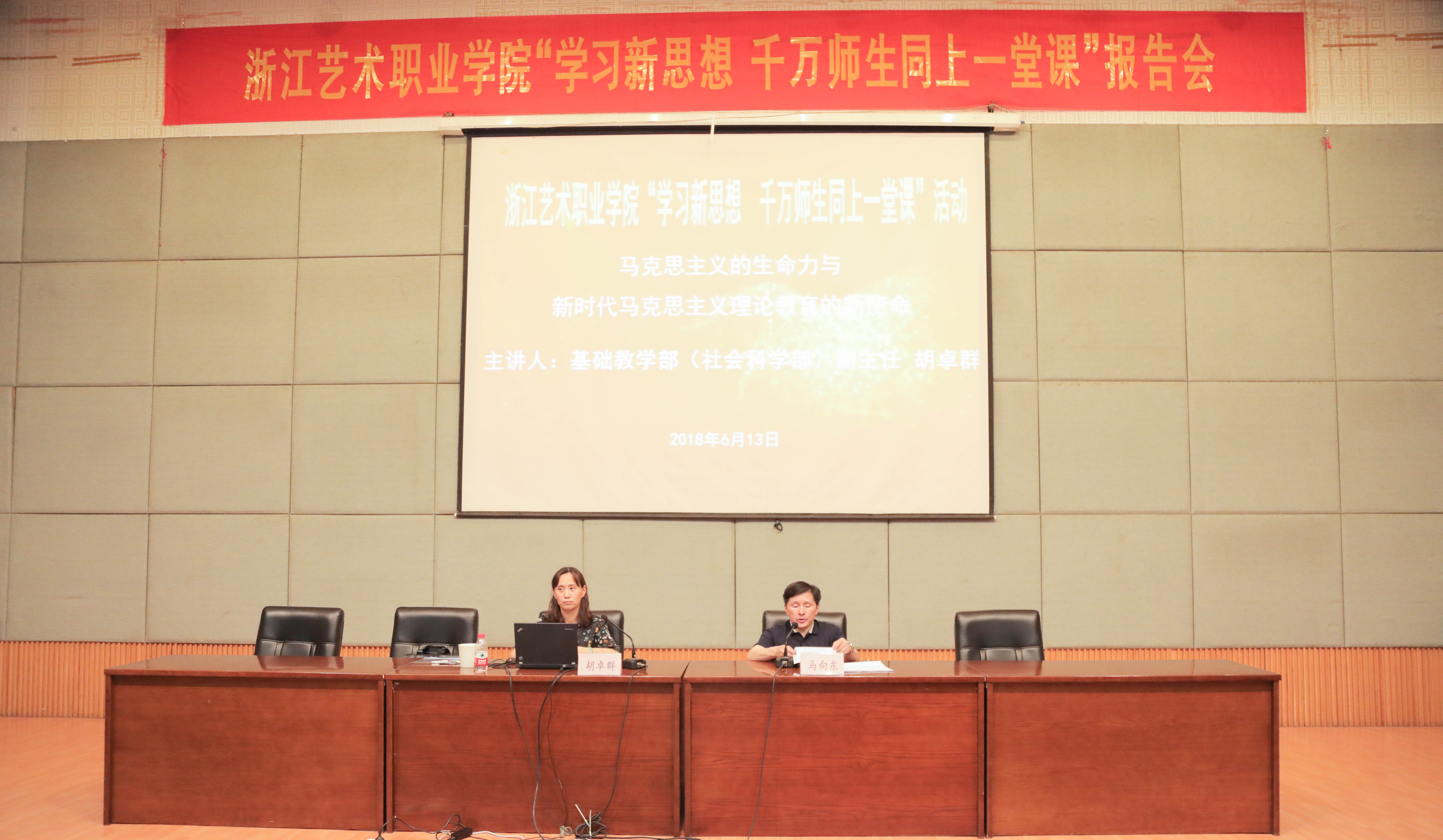 6月13日晚,基础教学部(社会科学部)副主任胡卓群作为校“学习新思想 千万师生同上一堂课”宣讲团成员,为全校六个教学系师生代表作题为《马克思主义的生命力与新时代马克思主义理论教育的新使命》的专题报告。校党委委员、宣传部部长马向东主持报告会。