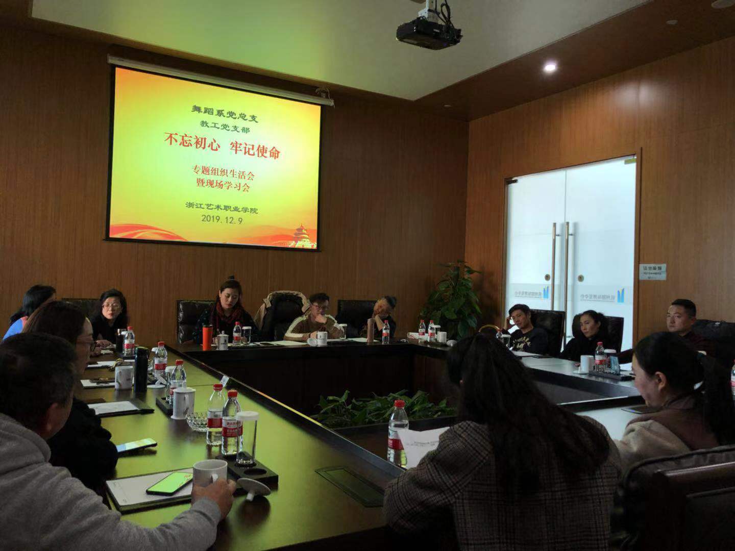 参观结束后,舞蹈系党总支组织全体教师党员在会馆会议厅举行了“不忘初心、牢记使命”专题组织生活会。舞蹈系教工党支部书记孙天添代表支部针对舞蹈系开展主题教育的情况、对党员的教育管理、联系群众、工作作风等方面的问题进行了深刻的剖析和检视,并提出了改进的措施。学生党支部书记高永美总结了一年以来学生党支部的相关工作,并提出了存在的问题和今后改进的方向。党员教师也针对自己近期以来主题教育的学习情况、感悟以及存在的问题进行了全面剖析,体现了共产党员勇于直面问题,敢于进行批评与自我批评的优良作风。会上还进行了2019年度舞蹈系优秀共产党员的评选。