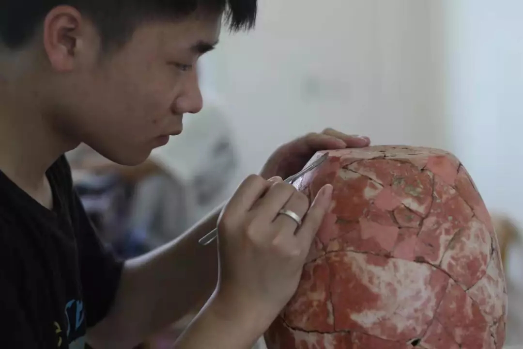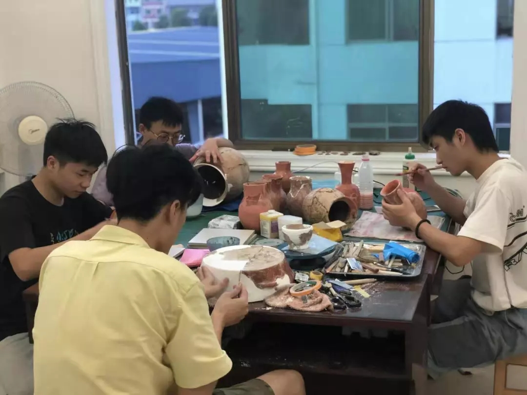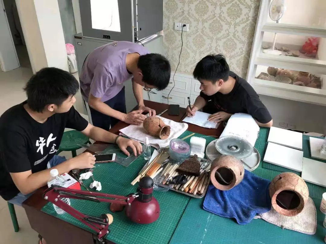 遗址的探方中随处散落着碎陶片,文物修复师生的工作就是将成百上千的碎片通过修复方案的确定,经拍照、档案记录、清理、拼接、补缺等修复工序,把碎片复原成器。众所周知,考古工作条件十分艰苦,修复的工地里没有空调,只有电风扇,正是文物修复师生们对专业工作的热爱与执着,才能顶着高温酷暑,放弃暑假休息和舒适的环境,投身到文物修复的重要工作中。
