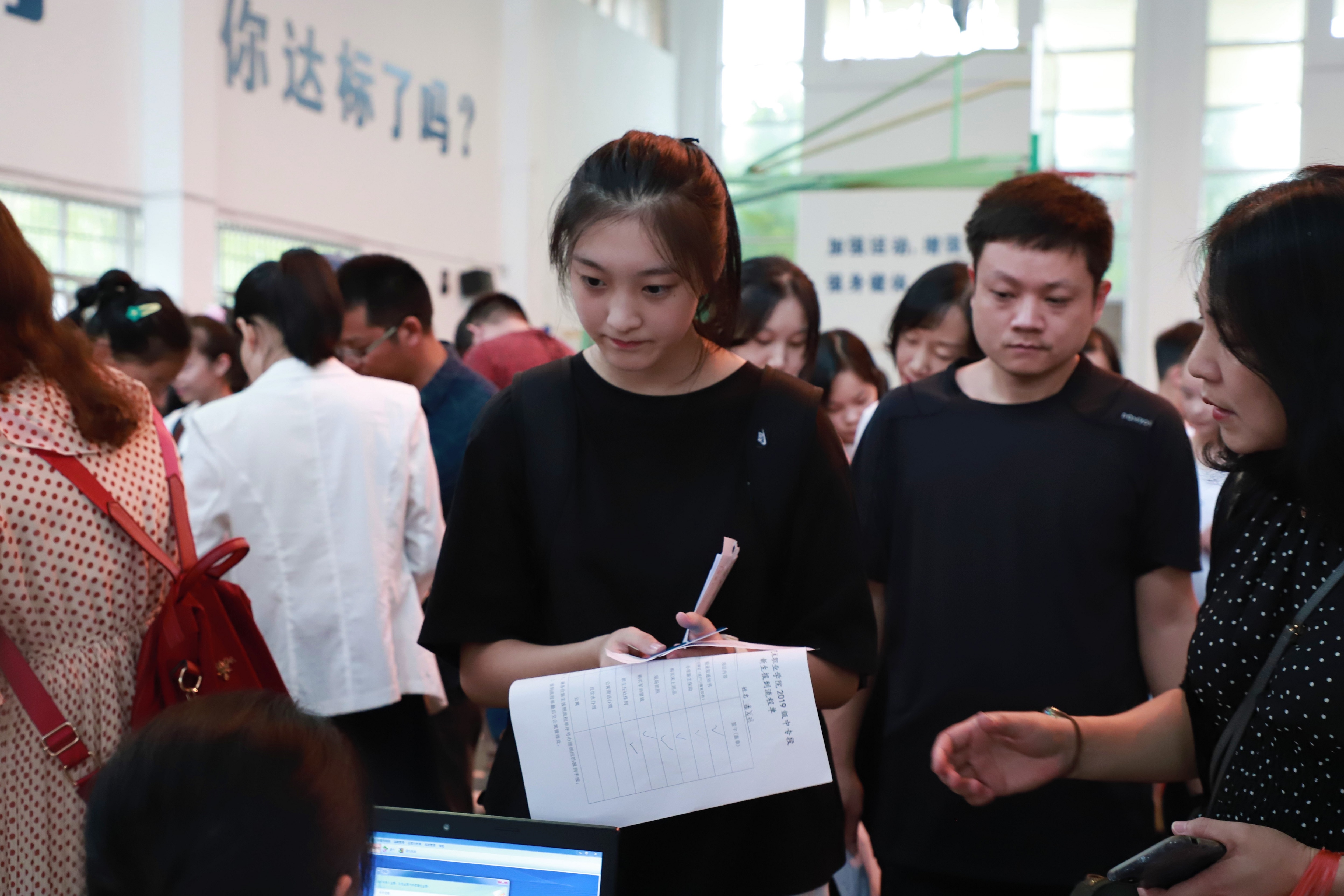 新生们独自在体育馆内办入学手续,家长们都在体育馆门口殷切地等着。一对来自金华武义的家长说:“浙艺的校园挺好,我们昨天就来了。孩子将在美术系就读动漫专业。报考浙艺是老师推荐,我们知道浙艺在培养艺术人才方面有很多成就。孩子现在很稚嫩,希望在大学里首先学会做人,再是学好专业,打好与工作衔接的基础,将来在社会上有一番成就。”