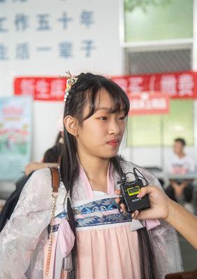 报到现场,还有两位穿着汉服来报到的姑娘,一位是学舞蹈编导的陈茜,另一位是歌舞专业的梁忆儿。两位萌萌哒的姑娘报到前在网上认识,相约穿着汉服来浙艺报到,希望能在浙艺的第一天有特别的意义。来自温州的陈茜说:“学舞蹈十几年了,从小就知道浙艺,出了很多明星校友,比如说周迅。五年前我就来考过浙艺,那时候考五年一贯制,可是那年没考上。从那时候就下决心高考一定要考上浙艺,今年终于考上了。希望接下来的大学生活,能做到最好就做到最好,将来考上专升本。”梁忆儿说:“我之前学的是音乐,现在来浙艺学习歌舞表演专业,很喜欢浙艺的艺术氛围。”