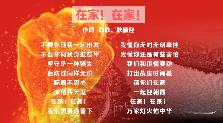 《在家!在家!》的歌词,是在战疫期间偶然看到上海张文宏医生的视频,他创作幽默风趣短视频的劝说大家都要呆在家里把病毒闷死。于是我就思考,希望运用填词的方法,与抗“疫”一线的医生同视角,用自己的歌词去向大家发出倡议,都“宅”在家中为抗疫做出贡献。