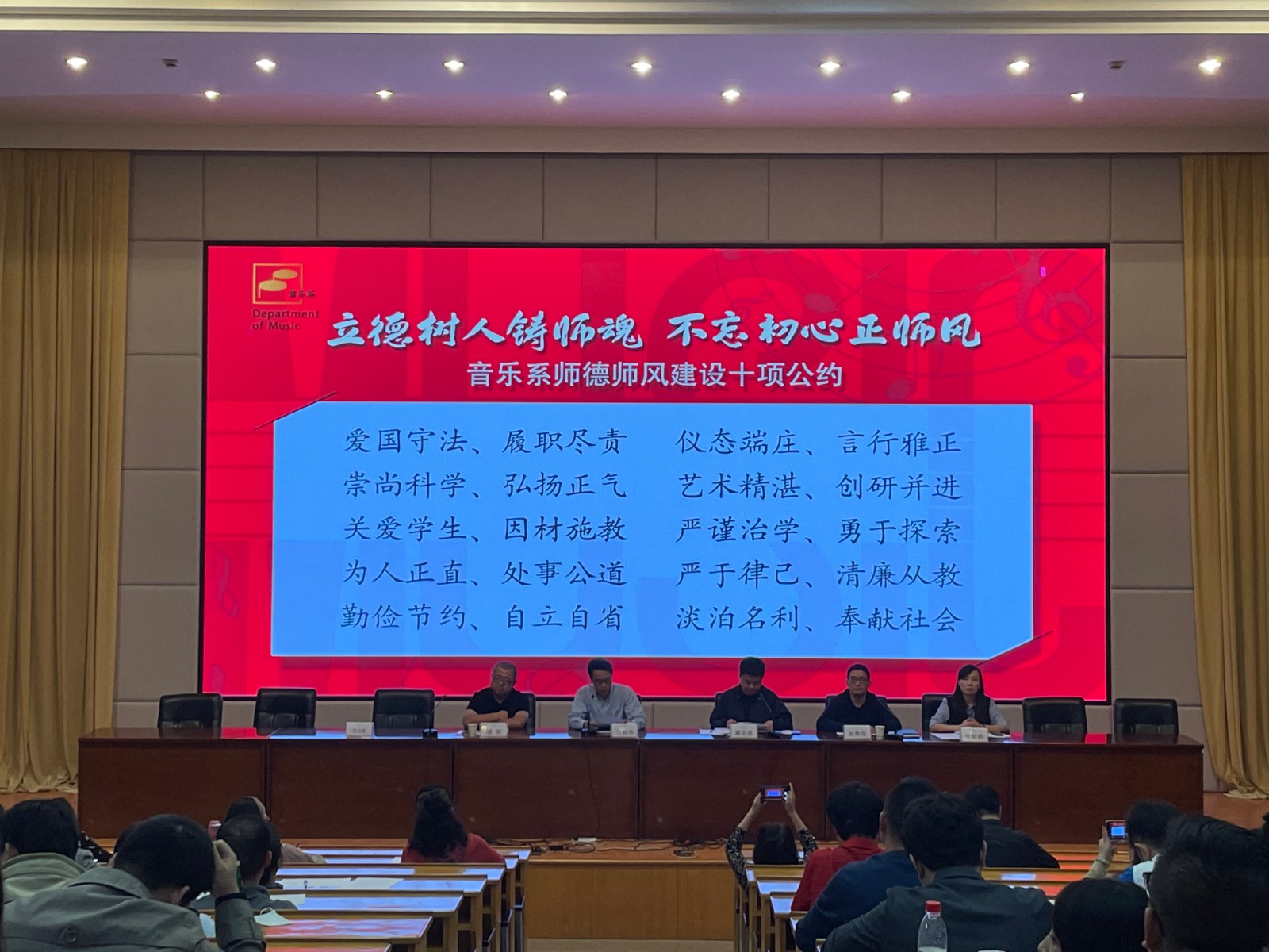 音乐系副主任潘骅宣读《音乐系教职工师德师风承诺书》,全体专兼职教师签署,进行庄严承诺,并开展师德师风情况自查。音乐系党总支专职副书记刘梦伟作师德师风失范案例警示教育。现场还重温了《音乐系师德师风建设十项公约》。