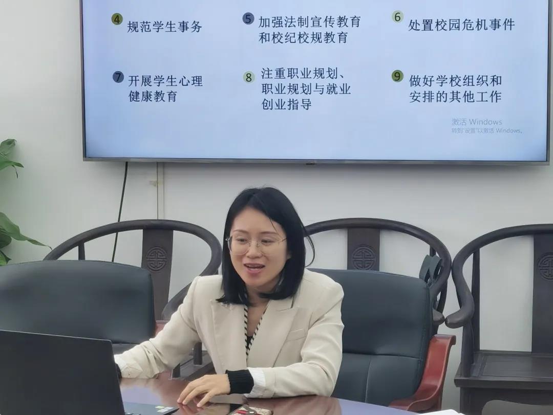 吴颖以“坚守有爱的教育,做有温度的班主任”为题,由摆正心态,做有爱的引路人为切入口,从做好学生思想政治教育和价值引领、强化班级建设、营造良好学风、规范学生事务、加强法制宣传教育和校纪校规教育、处置校园危机事件、开展学生心理健康教育、职业规划与就业创业指导和做好学校组织安排的其他事情等九大块面阐述了班主任的主要工作职责,并引出找准方法,做有心的助跑者的论点。重点从重视新生入学教育、重视班级每一次班会、加强班级班干部队伍建设三方面来加强班级管理;深入学生,经常性谈心谈话、关心班级“特殊”群体、正确对待学生,善于解决各式各样的问题三方面分享学生管理工作方式方法。她指出,班主任要抓住教室、寝室、排练厅“三个主阵地”,把学生的教育管理抓严、抓广、抓实,抓出成效。