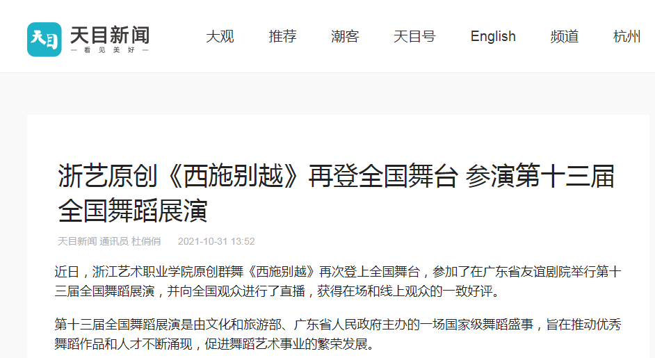 天目新闻:浙艺原创《西施别越》再登全国舞台 参演第十三届全国舞蹈展演