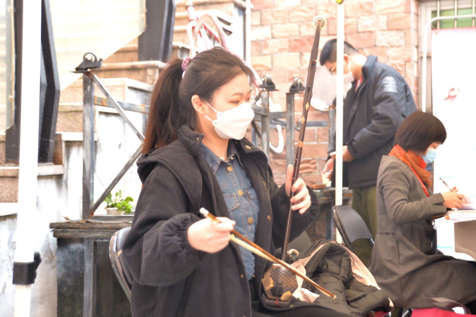 考生们在排队等候时的状态各有不同,或在候考室进行热身,或低头默记曲谱,或在一旁做深呼吸调整情绪。而在校外等候的家长也不轻松,有的家长频频望向校内,有的通过视频电话和其余在家中等候的家人们交流孩子的状况。