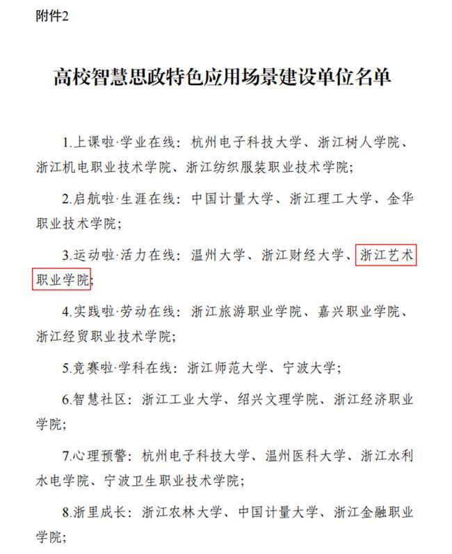 近日,浙江省教育厅公布第二批高校智慧思政特色应用试点单位名单与应用场景建设单位名单,我校成功入选,运动·活力在线被列为高校智慧思政特色应用场景建设单位。此次共有浙江工业大学、浙江师范大学、中国计量大学等15所高校入选试点单位。