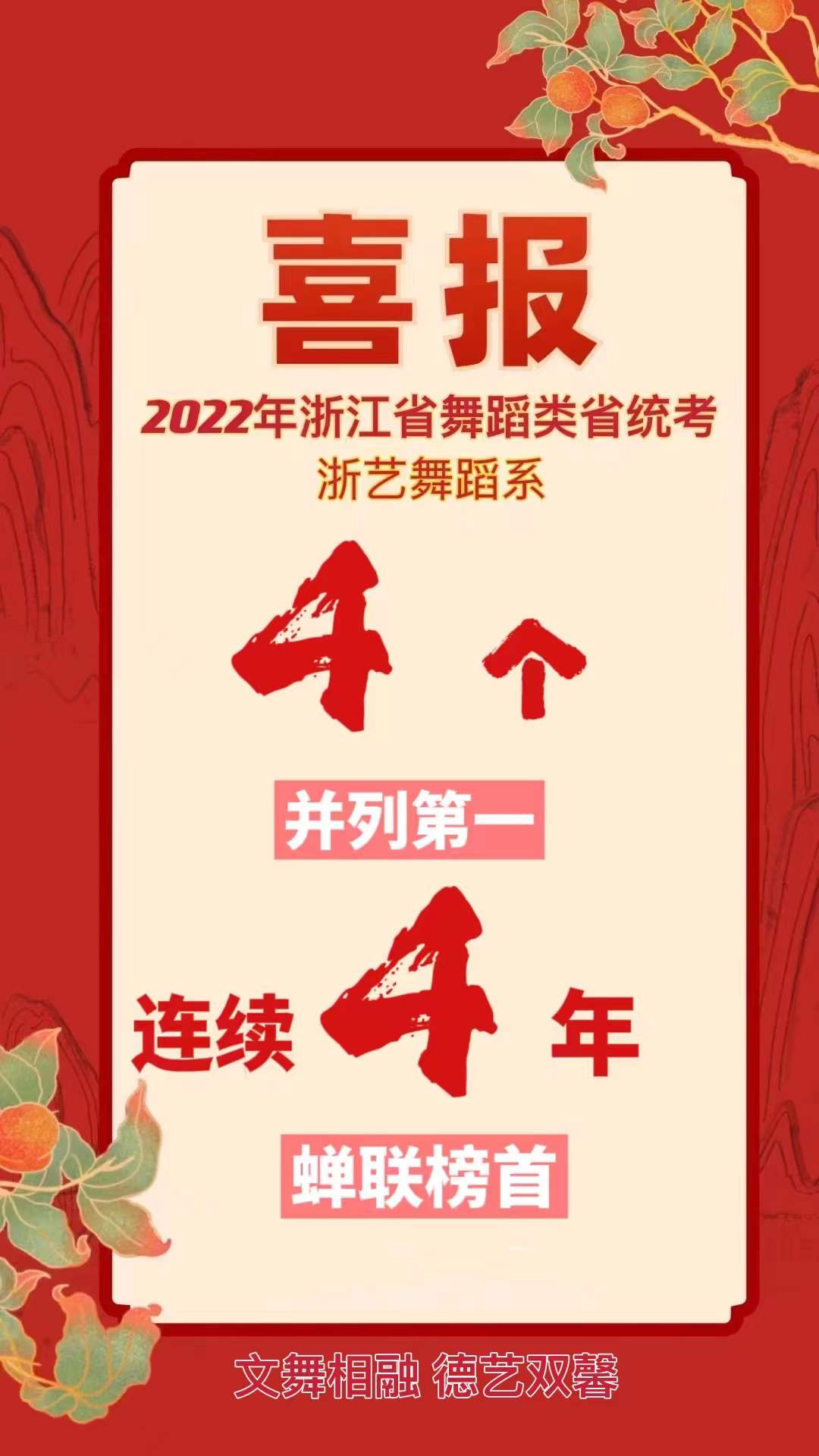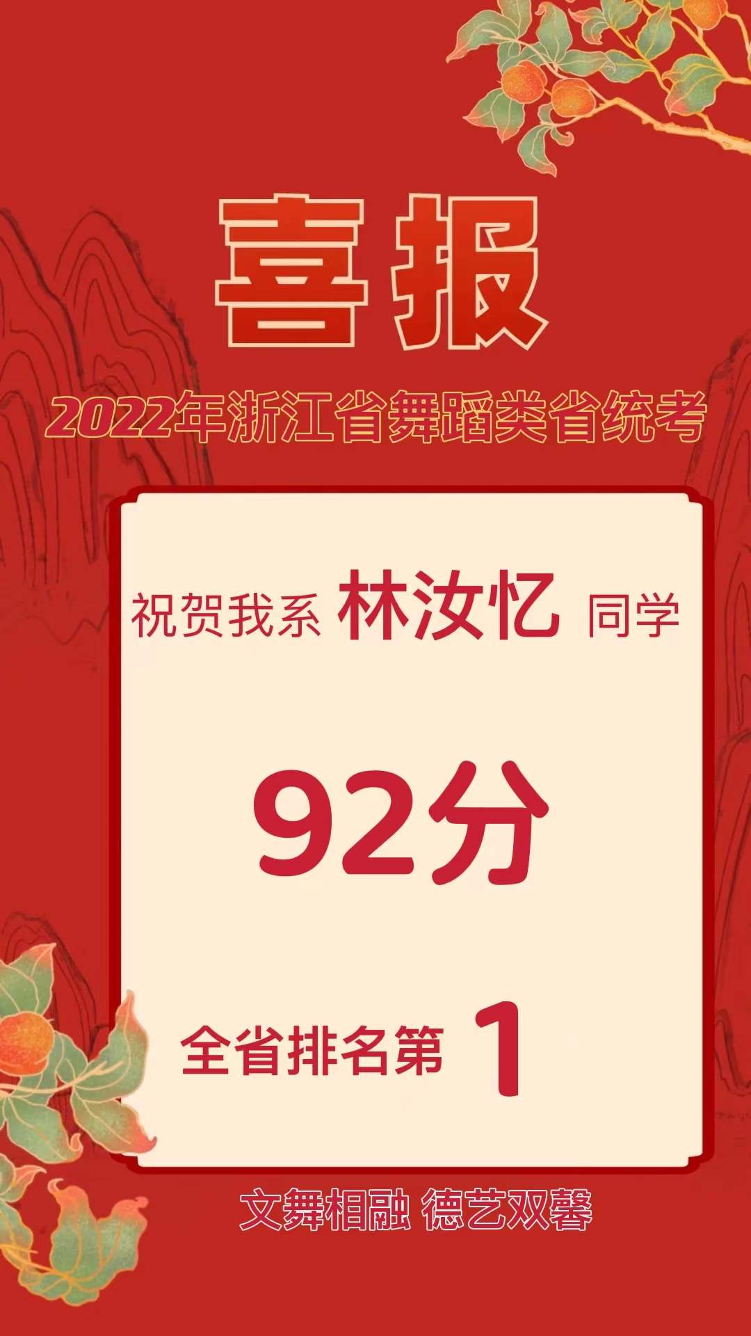 1228日,2022年浙江省普通高校招生艺术类专业省统考成绩公布,舞蹈系16小舞班毛长俊、徐幸恬、苏瑶、林汝忆4名同学以92分的高分成绩并列全省第一,金成柯同学以一分之差位列全省第五。全省前10名中,我系学生就占领了6位,连续六年蝉联省统考榜首。
