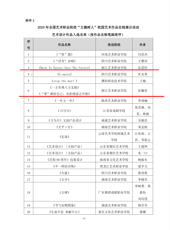 1月30日,全国文化艺术职业教育教学指导委员会公布2020年全国艺术职业院校“立德树人”校园艺术作品在线展示活动入选作品名单,我校13个作品入选。舞蹈作品《山村记忆》入选校本剧(节)目,作品《Back To Nature Save The Future》(作者:沈思伶)、《一方有难 八方支援》《“罩”顾好自己,从拒绝谣言开始》(作者:彭瀚莹)、《礼赞·玺节》系列文创产品设计(作者:徐博、刘宗胜、张永鹏、林慧如、石燕、陈涵通)、《百年望道——建党100周年标识设计》(作者:王欣如)、《百年辉煌——建党100周年标识设计》(作者:格桑次仁)、《百年辉煌——建党100周年标识设计》(作者:施郑杰)、《百年辉煌——建党100周年标识设计》(作者:李滨)、《百毒不侵》防疫产品系列包装设计(作者:樊祉祺)、《安全通行—遵守规则,远离病毒》(作者:梁天怡)、《法自然·共生》公益海报设计(作者:张露、麻均辉)、《嫁》(作者:李雯清)入选艺术设计作品。