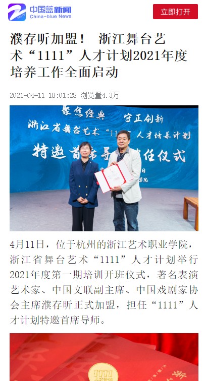 中国蓝新闻:濮存昕加盟! 浙江舞台艺术“1111”人才计划2021年度培养工作全面启动