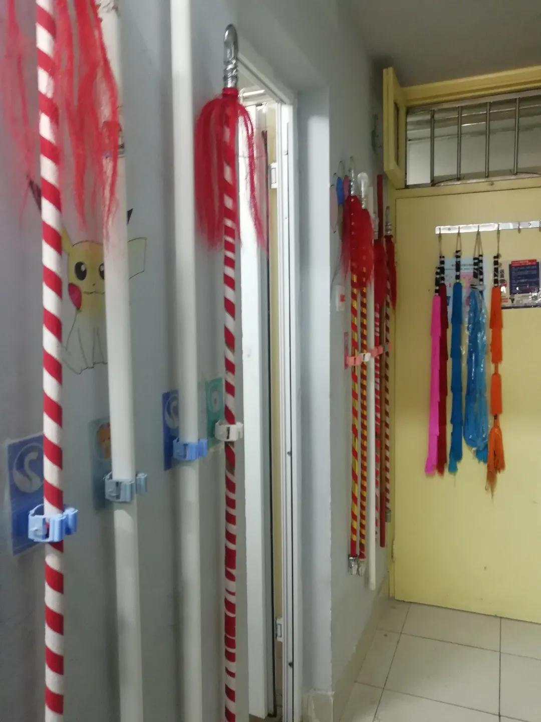 2019级小百花班学生陈子心说:“寝室要整洁美观,首先就要保证寝室卫生。不能放过每一个缝隙、角落,尤其是平时经常注意不到的卫生死角,都要打扫干净。刀、枪、马鞭……这些是我们练功的道具,平时摆放不善很容易显得凌乱。我们把它们整整齐齐排列在墙上,变成了一道风景。我们还在墙上安放了环保材料的网格,贴上了大家练功、演出、生活的照片,使寝室显得更加温馨。”