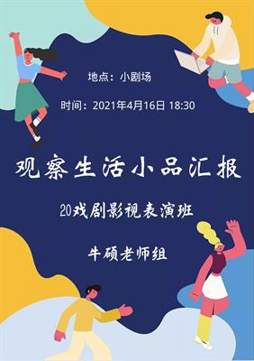 4月16、20日,戏剧系在2号楼小剧场举行2020级戏剧影视表演班观察生活交流小品汇报会,由教师牛硕、吉京京指导,戏剧影视表演教研室全体教师到场观看。