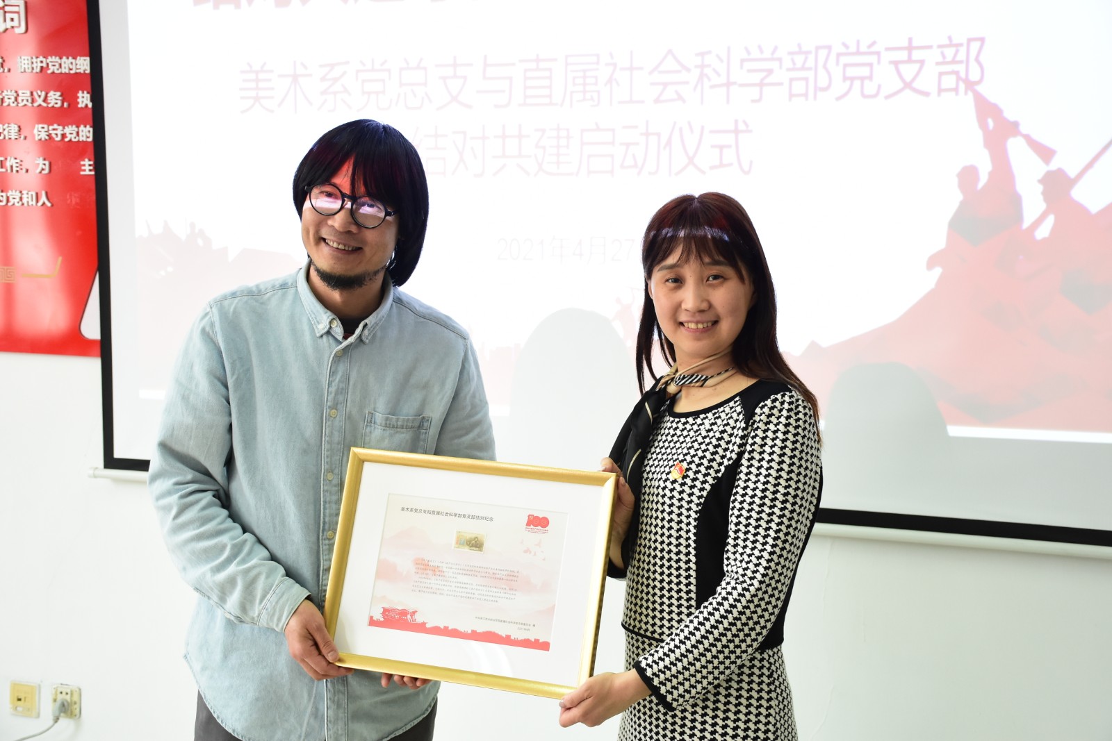 美术系常务副主任李昌国、社会科学部副主任胡卓群代表双方互赠纪念品。