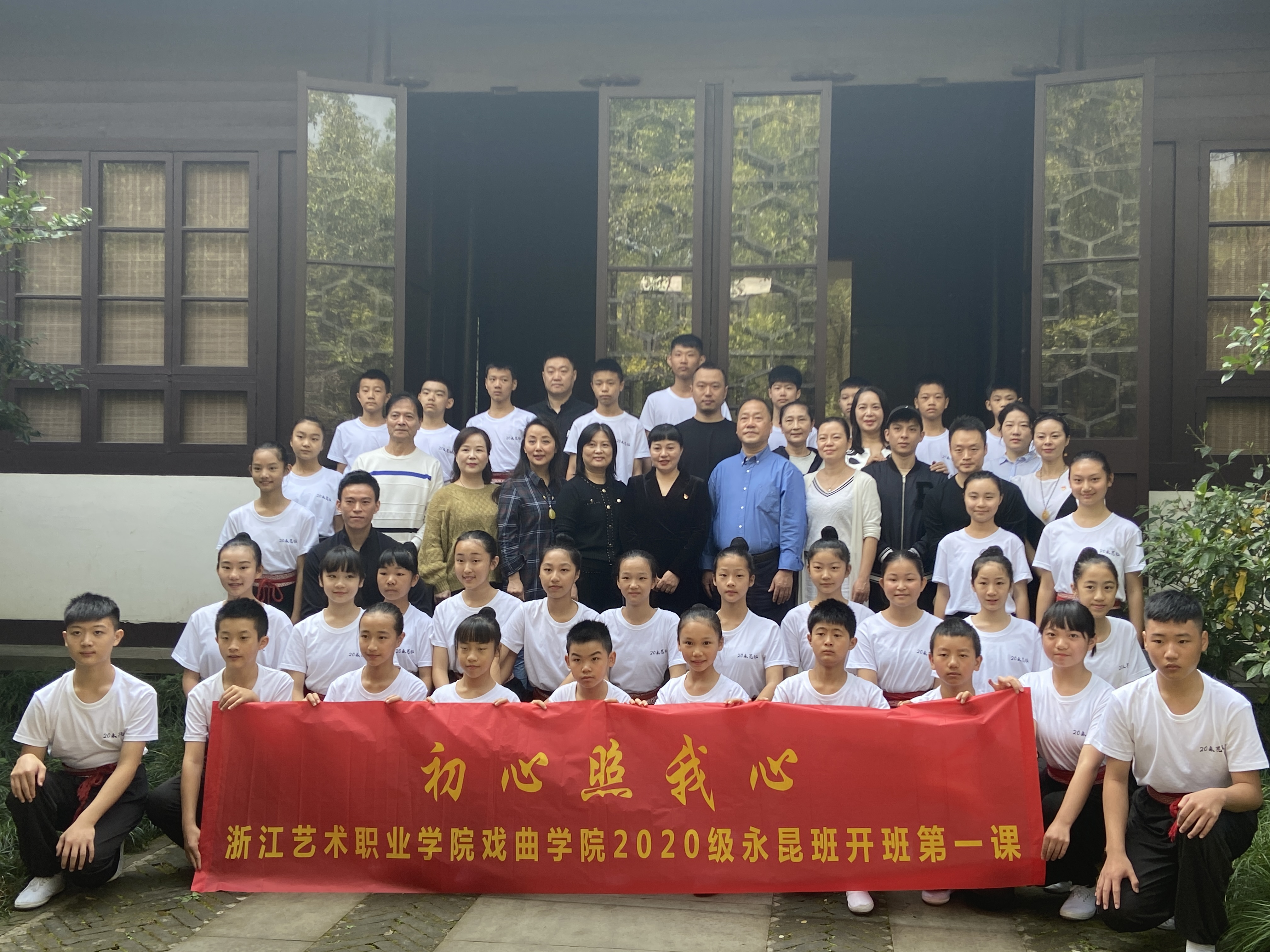 2020年10月11日,戏曲学院2020级永嘉昆剧班“初心照我心”开学第一课在盖叫天故居举行,34名白衣少年寻访梨园名家、曾在学校任教的前师先贤——京剧表演艺术家盖叫天故居。盖叫天杰出的艺术成就来源于日复一日的勤学苦练,虽曾断臂折腿而始终坚持不懈练功习艺。盖老故居庭院里,迎面就立着盖老手持剑,单腿站立,眼观远方的铜像,学子们向梨园宗师致敬,向在场的老师们行“三拜”礼,立志在学艺道路上勤勉精进。在“山映斜阳天接水”的秋日,在浙艺校歌《梦想开始的地方》的旋律中,昆曲又有了新一代传承者,34颗跃动的心,为传承,出发。