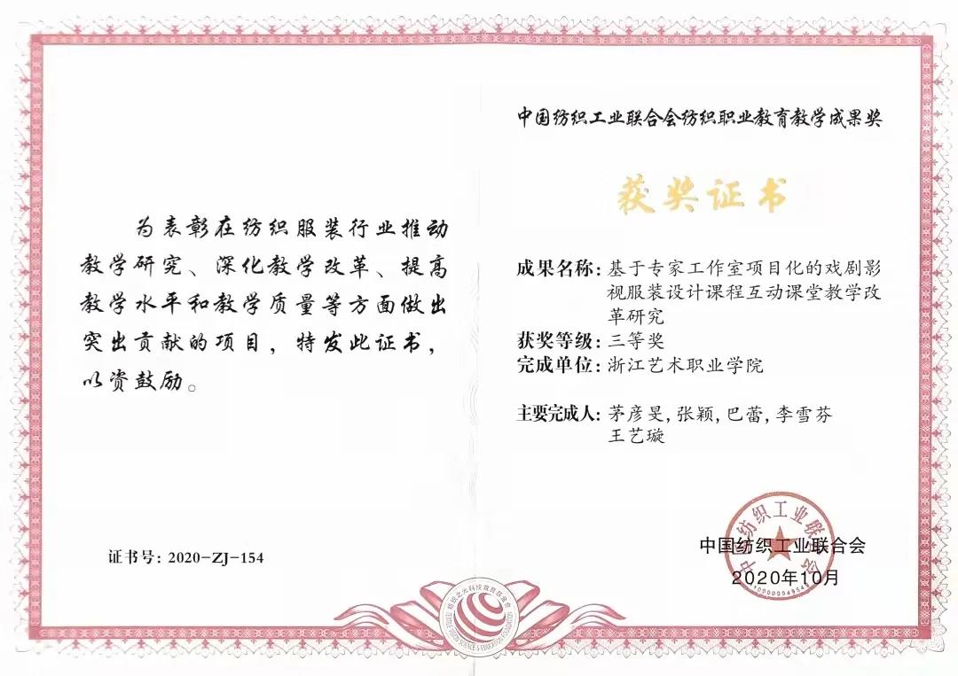 参加浙江省第十九届大学生多媒体作品设计竞赛荣获1个二等奖,2个三等奖。参加“纺织之光”2020年度中国纺织工业联合会纺织职业教育教学成果奖获三等奖。海报作品《致敬逆行者》荣获浙江省高校“寻找身边的感动”十佳书画作品奖。