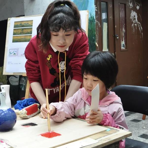 第二天,“手绘工坊——宋韵童心”开课啦,由学院师生带领孩子们进行《千里江山》图卷的手工制作和藏书票的印制。孩子们在东西画室的用工具制作自己的千里江山图卷和藏书票,他们兴致盎然,在画纸上创造出了一幅幅精美的作品,丰富的想象力让作品创作变得独特而精美。
