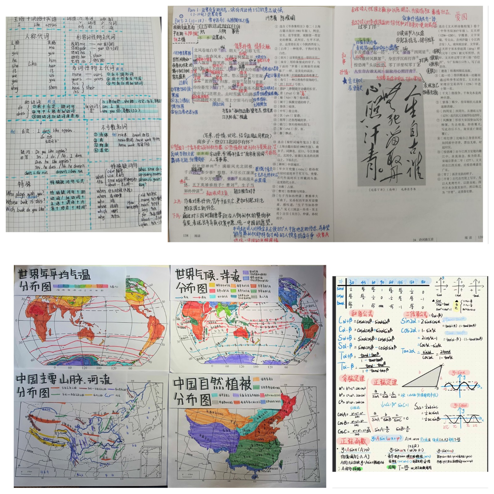 这些笔记均为附中段学生的手写笔记,既有记录详实的内容罗列型,又有框架结构式的思维导图型,有的素雅简洁,有的被彩笔圈画勾勒以凸显重点,还有的认真整齐的记录自己的学习心得。一撇一捺里都是郑重,一笔一画间皆是用心,用一方小小的笔记记录知识、掌握知识、运用知识,呈现了附中学子课堂的认真,课下的勤奋。