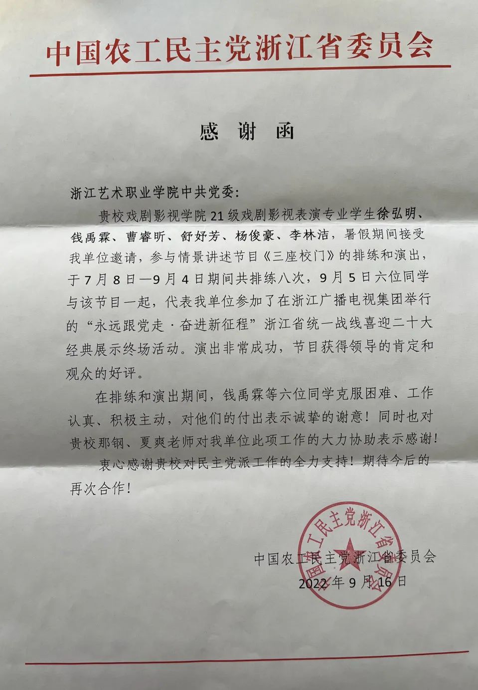 由戏剧影视学院2021级戏剧影视表演专业学生钱禹霖、曹睿昕、李林洁、舒妤芳、杨俊豪、徐弘明表演的情景讲述节目《三座校门》,代表中国农工民主党浙江省委员会参演。