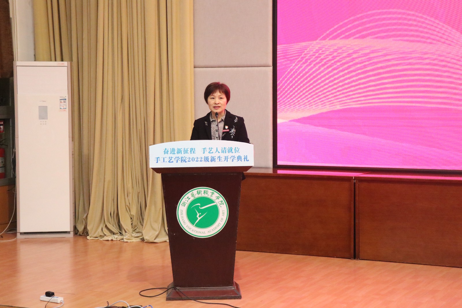 手工艺学院党总支书记、副院长金银琴寄语新生们不断充实三年大学生活,要坚持理论与实践同行,在学习路上求稳致远;要坚持奋斗和友谊同行,在成长路上携手共进;要坚持理想与时代同行,在复兴路上奋勇争先。将青春小我融入时代大我,珍惜大学时光,塑造更优秀的自己。