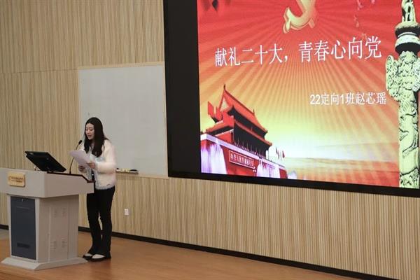 22定向1班的赵芯瑶以共产党百年历史为引,介绍了自己作为乡镇文化员的亲身经历,她在工作中与红色结缘、与古物对话,更加坚定了实打实干的奋斗目标。她号召青年要将自己的热情奉献给热爱的事业,在四季付出汗水,用美景描绘诗篇,担当起新时代赋予青年的责任。