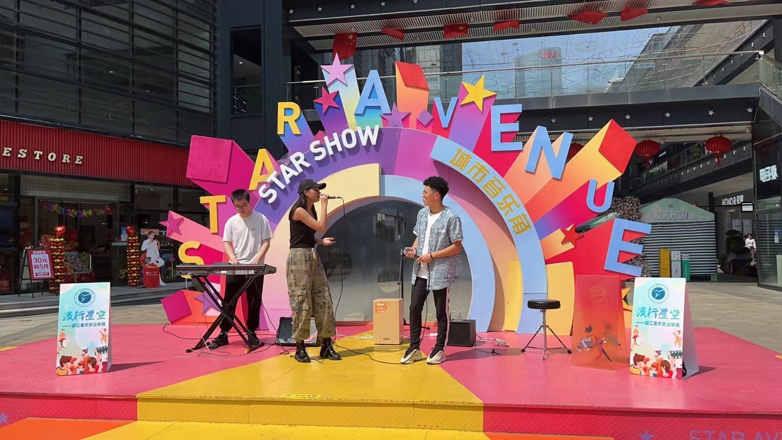 在星光大道电影文化艺术街区,音乐学院流行教研室、声乐教研室和街舞社共同打造“流行星空”