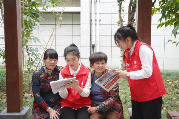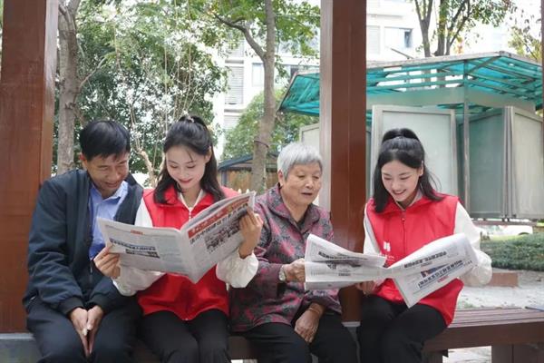 同学们和居民们围坐在一起,通过报纸领读,逐字逐句带领居民学习党的二十大报告精髓,与居民们结合报告中的关键与核心,谈体会,话未来,畅想未来美好生活。