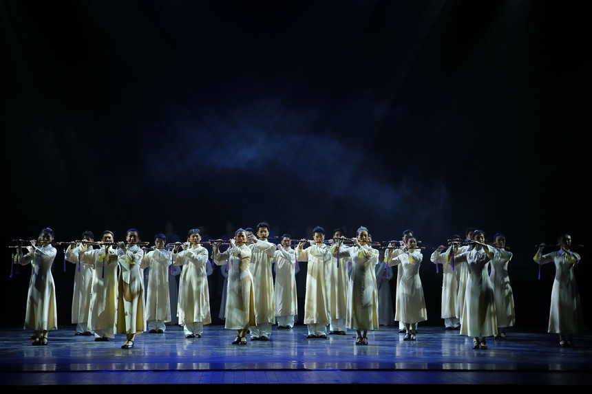 第三是他的悲悯情怀。在第四场里,赵松庭不顾家族反对,抛下善解人意的新婚妻子,在抗美援朝的召唤声中,为保家卫国毅然奔赴前线。在朝鲜战场上,面对的是冰天雪地里随时可能牺牲的生存境况,但小河南、小山东、小四川等一个个鲜活、生动的小战士们,他们的乐观心态,爱憎分明的坦荡胸怀,不仅使他们结下了纯真的革命友谊,也使他感受到了人性人情的魅力和真实动人的情感。特别是当赵松庭了解到这些小战士参加志愿军背后惨绝人寰的故事,更让赵松庭坚定信仰——不当亡国奴,与敌人拼杀到底!在这样的精神感召下,赵松庭虽没能与敌人真刀真枪厮杀在战场上,但他可以用手中的小小竹笛,为战士演奏助威、鼓舞士气,用文艺的力量同样能挺立于战争第一线。在这里,笔者觉得特别感人的一幕是,当赵松庭问战士们最大的愿望是什么时,这些腼腆、可爱的大孩子们,想的是战争胜利后能不能跟赵松庭学吹笛子,希望到时候赵松庭不会嫌弃他们学得慢……这是多么朴素的愿望,又是多么感人肺腑的言行。这一切,也点点滴滴影响着赵松庭,促他成长、助他奋进。
