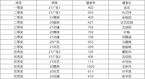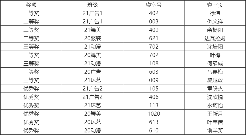 本次走访寝室结合寝室美化大赛评比活动,老师们对参赛寝室逐一进行评比打分,15个优秀寝室脱颖而出,分别是:
