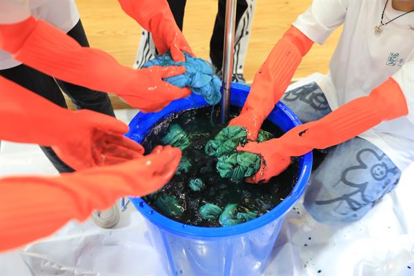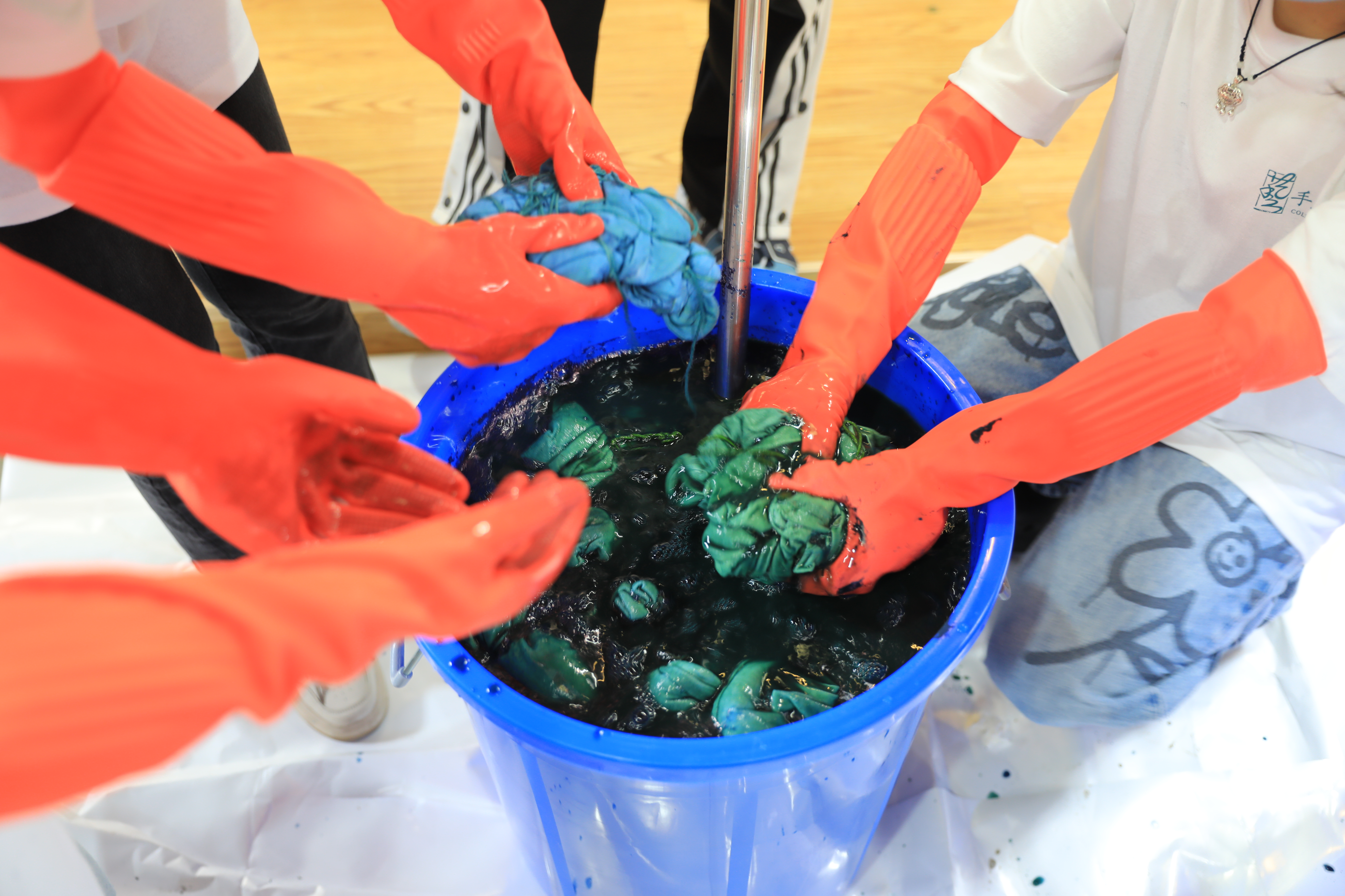 扎染邂逅“布”里生花。村民们在手工艺学子的帮助下对衣物进行扎、缚、缀、夹等各种组合形式,在浸泡吸水后放入染料中,拆线晾干后,一件件别出心裁的作品展现出手工扎染的痕迹美、色晕美、朴素美。