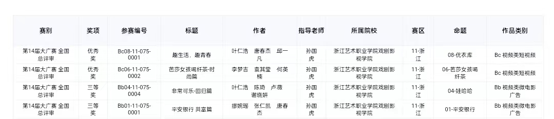 浙艺学子积极报名参赛,与各高校硕本专学生同台竞技,在经历了学校初评、赛区评选、全国总评审的层层严格选拔后,4项参赛作品在1869所高等院校,共计74万件作品中脱颖而出,在所有等级奖中是唯一一所获奖的高职院校,让我们一起来看看吧!